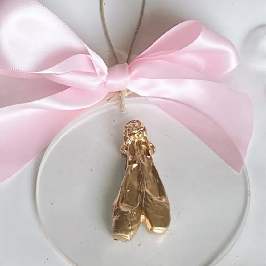 This beautiful Gold Leaf Gilded Ballet Slippers Ornament is handcrafted and brushed in gold leaf and so dainty. Mounted to a 4x4 acrylic plate and accented with a satin ribbon. Sweet keepsake gift for a little dancer.