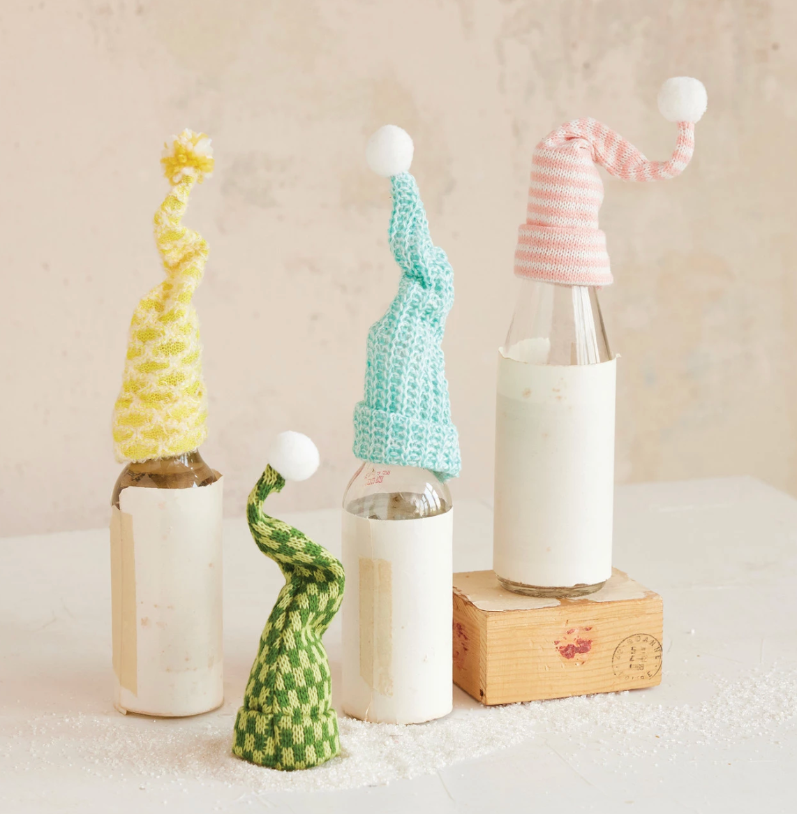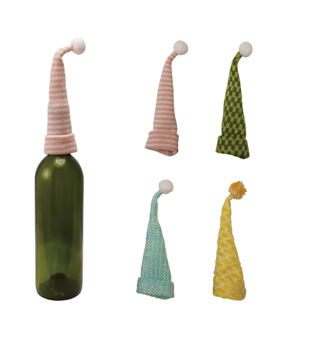 Add a festive and playful touch to your holiday gifts with this 8" Knit Fabric & Wire Hat Bottle Topper. Available in four cheerful colors—Blue, Green, Pink, and Yellow—each topper features a cozy knit design with a pom pom and is sold individually. Perfect for adorning wine bottles, these charming toppers make gift-giving extra special and add a whimsical accent to any celebration.