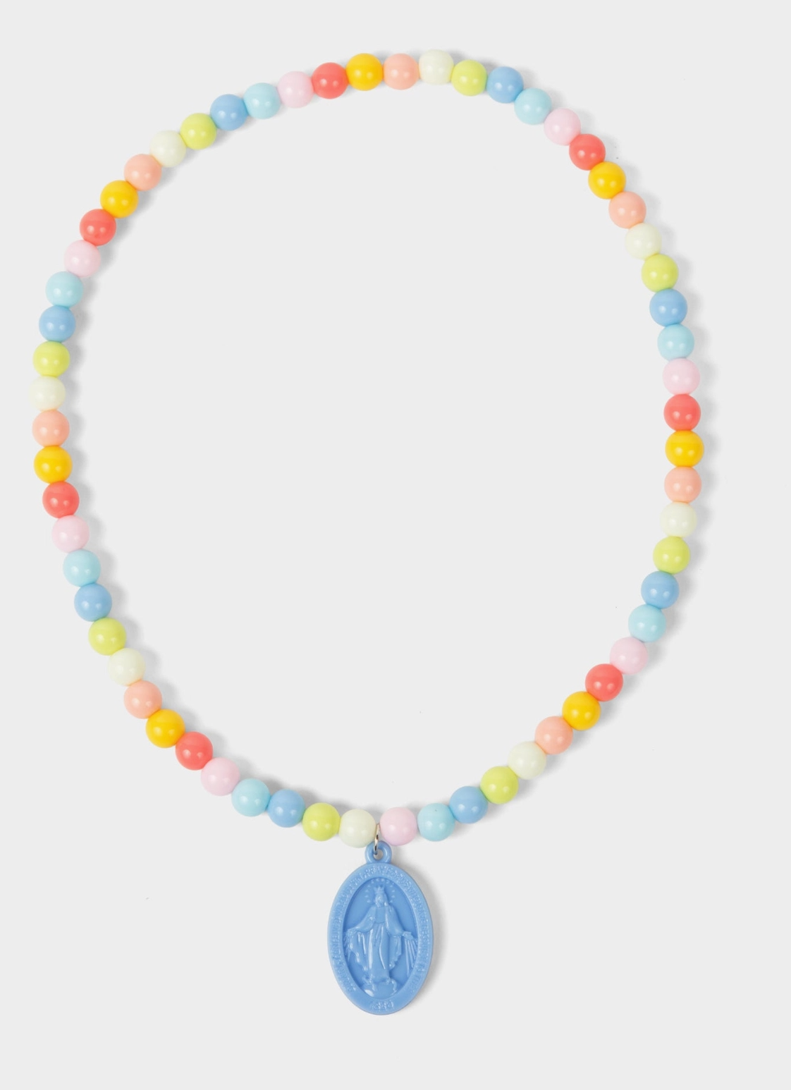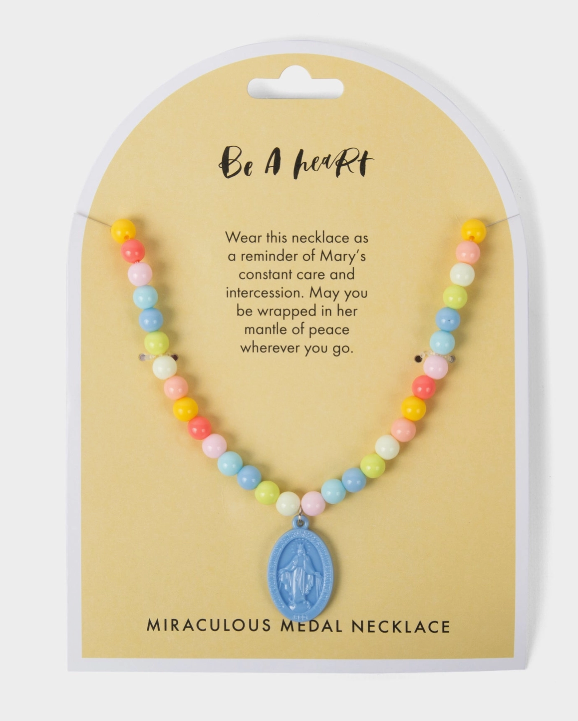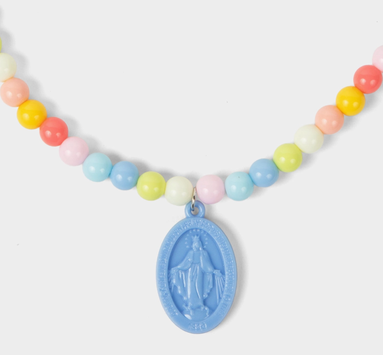 A sweet and meaningful way to introduce Marian devotion to little hearts. Our Children’s Miraculous Medal Necklace features a cheerful strand of colorful plastic beads and a soft blue Miraculous Medal—reminding children of Mary’s loving protection wherever they go. "Wear this necklace as a reminder of Mary’s constant care and intercession. May you be wrapped in her mantle of peace wherever you go.” * Elastic strand for easy on and off * Bright, joyful colors little ones will love. * Durable and lightweight for everyday use. * Perfect gift for First Communion, birthdays, or just because. Gift-ready and packaged with meaning, this necklace is a beautiful way to nurture faith from the earliest years.