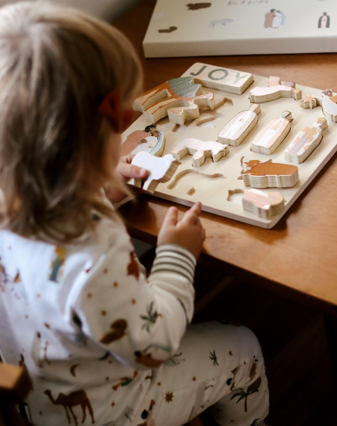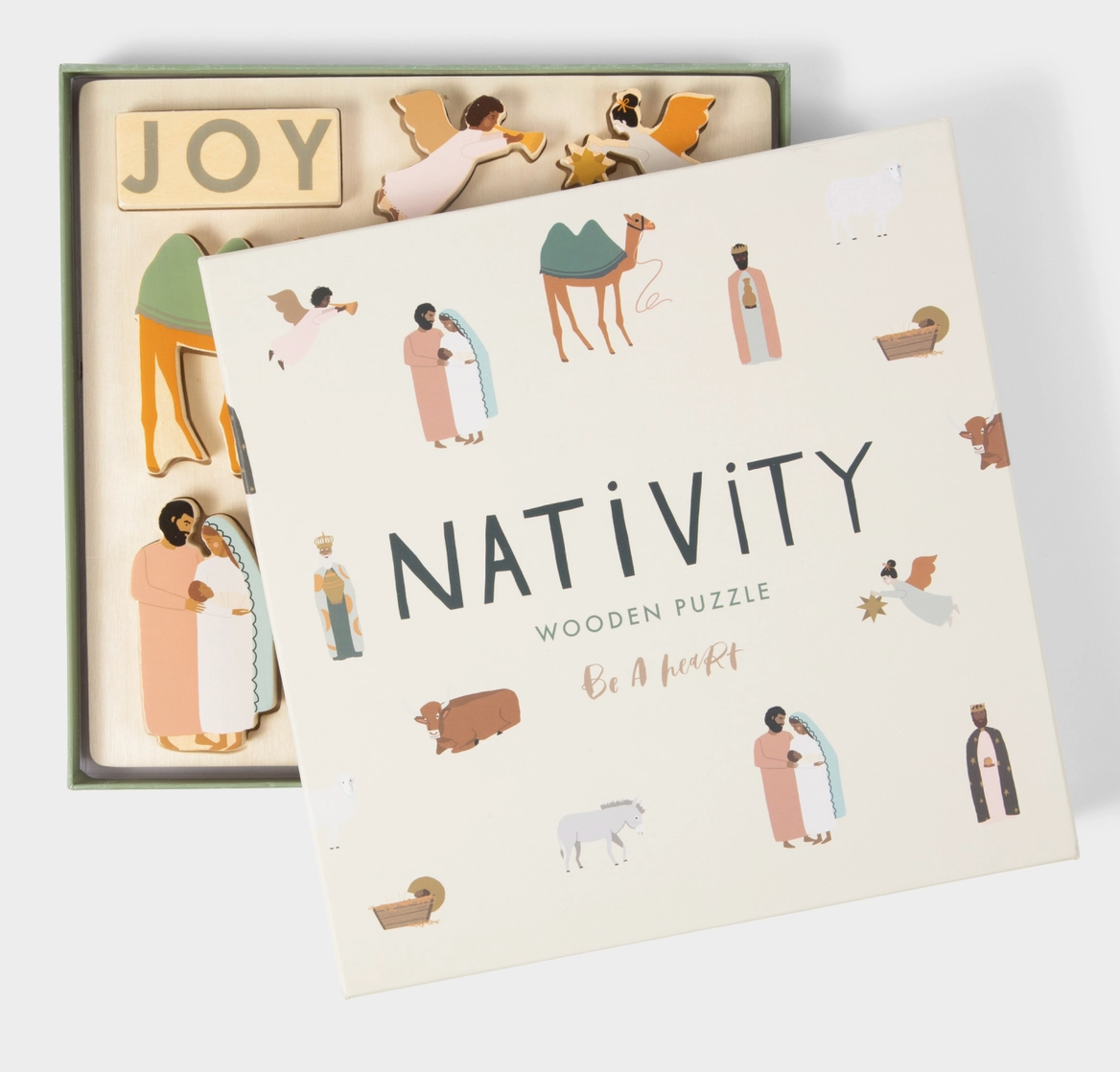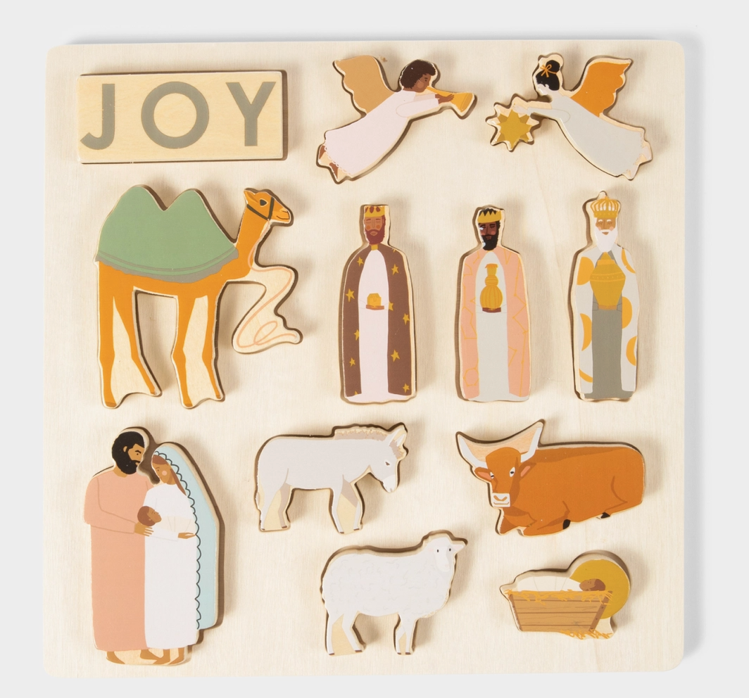 Nativity Wooden Puzzles have quickly become one of our best-sellers of all time, but especially for the holiday shopping season! We are currently accepting pre-orders for Fall 2023. Based on pre-orders is how many we will order from our manufacturer. Teach little ones about the meaning of Christmas. The Nativity Wooden Puzzle is a unique puzzle to pull out during Advent and the Christmas season. Can be a puzzle or stand up the pieces on their own to make your own Nativity Set! It includes the three kings, two angels, a camel, Mary and Joseph holding baby Jesus, Jesus in the manger, a donkey, sheep, and ox, and the letters for JOY. The wooden pieces are thick enough to stand on their own for multiple ways to play. 10 in x 10 in 14 large pieces The puzzle is recommended for ages 12+ months.