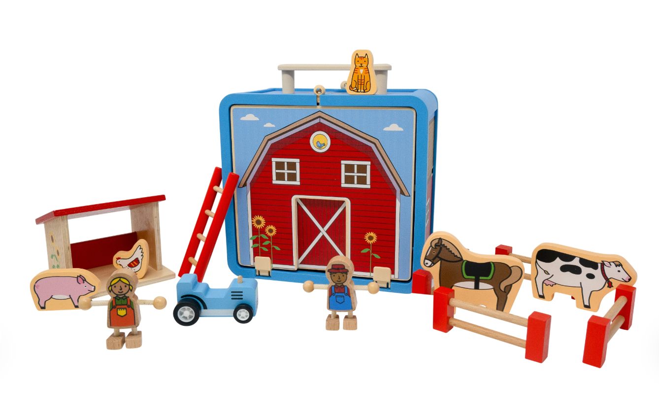 Introducing our new Suitcase Series that encourages portable play. Each wooden suitcase opens up to a world of fun. The 16-piece Barnyard has everything for fun on the go, including farmer kids, fences, farm animals, a tractor, and more!