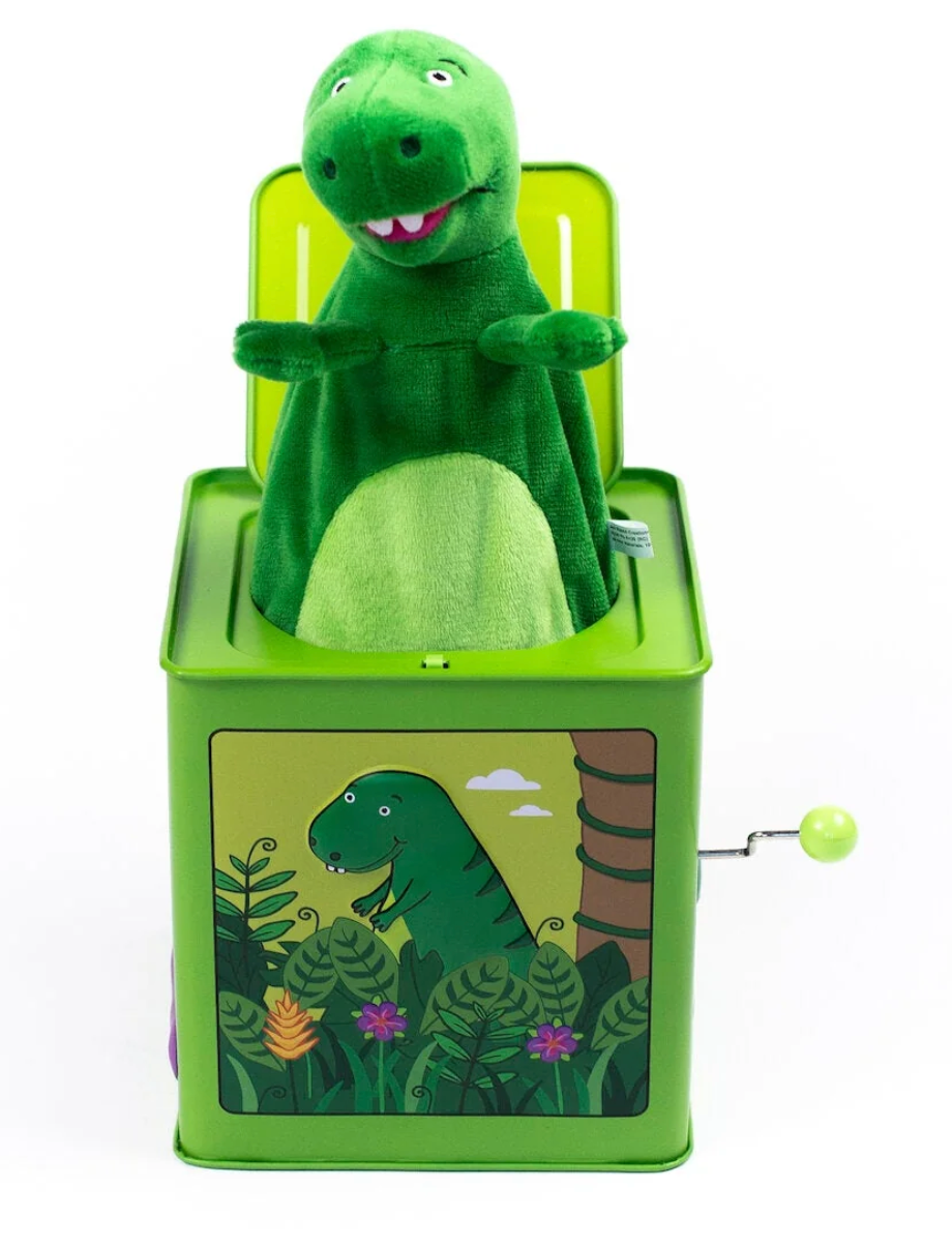 Jack-in-the-Boxes have been a time-honored favorite toy since the 1500’s! Jack Rabbit Creations creates a twist on this classic, with all original art, cuddly plush characters, and unique play-along songs. Surprise your youngsters with this friendly Dino Jack in the Box that plays “Pop Goes the Weasel”.