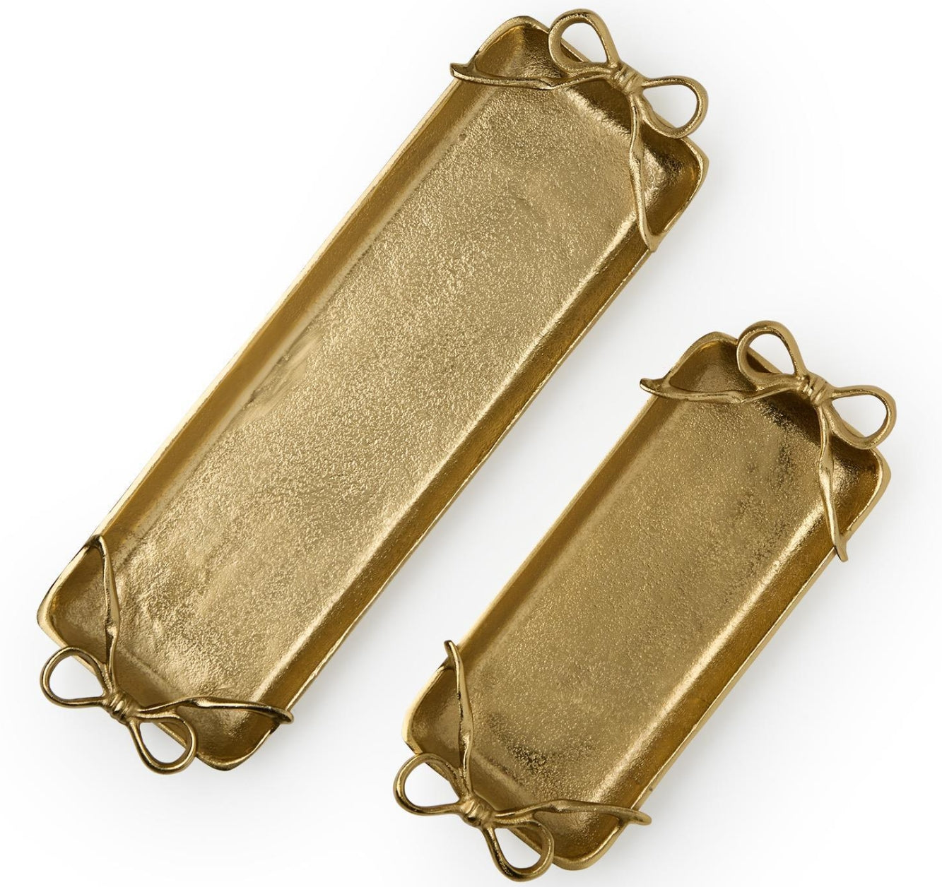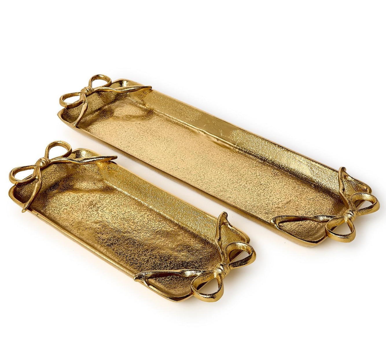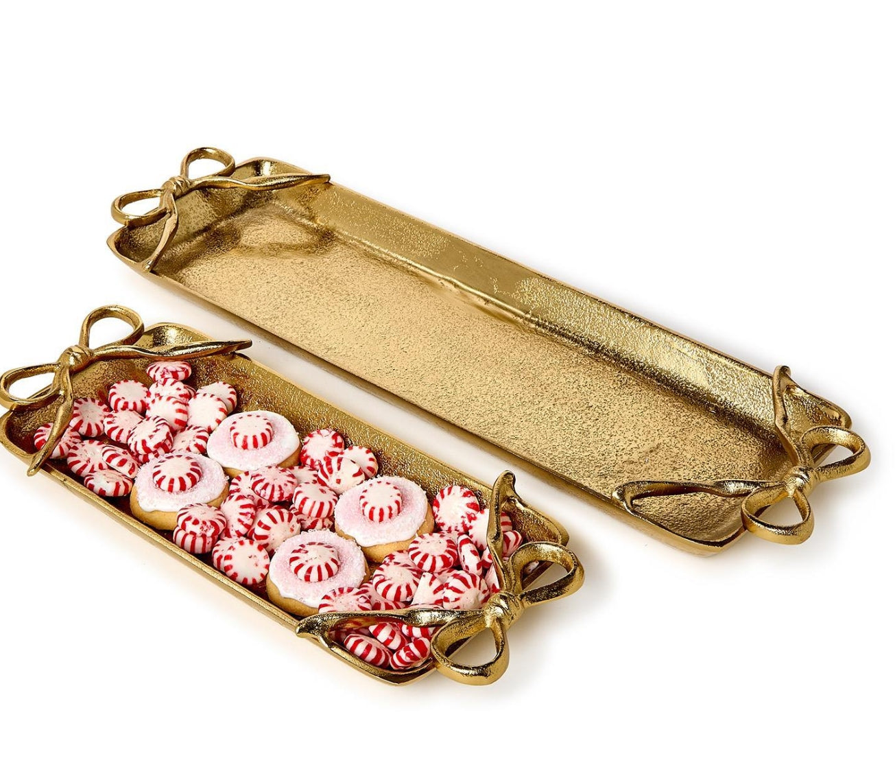 This gold-handled tray features elegant bow details and comes in two sizes, offering versatility for various serving needs. Made from durable aluminum, these trays are perfect for food presentation or as stylish accents on your table. They are food safe and add a touch of luxury to any occasion.