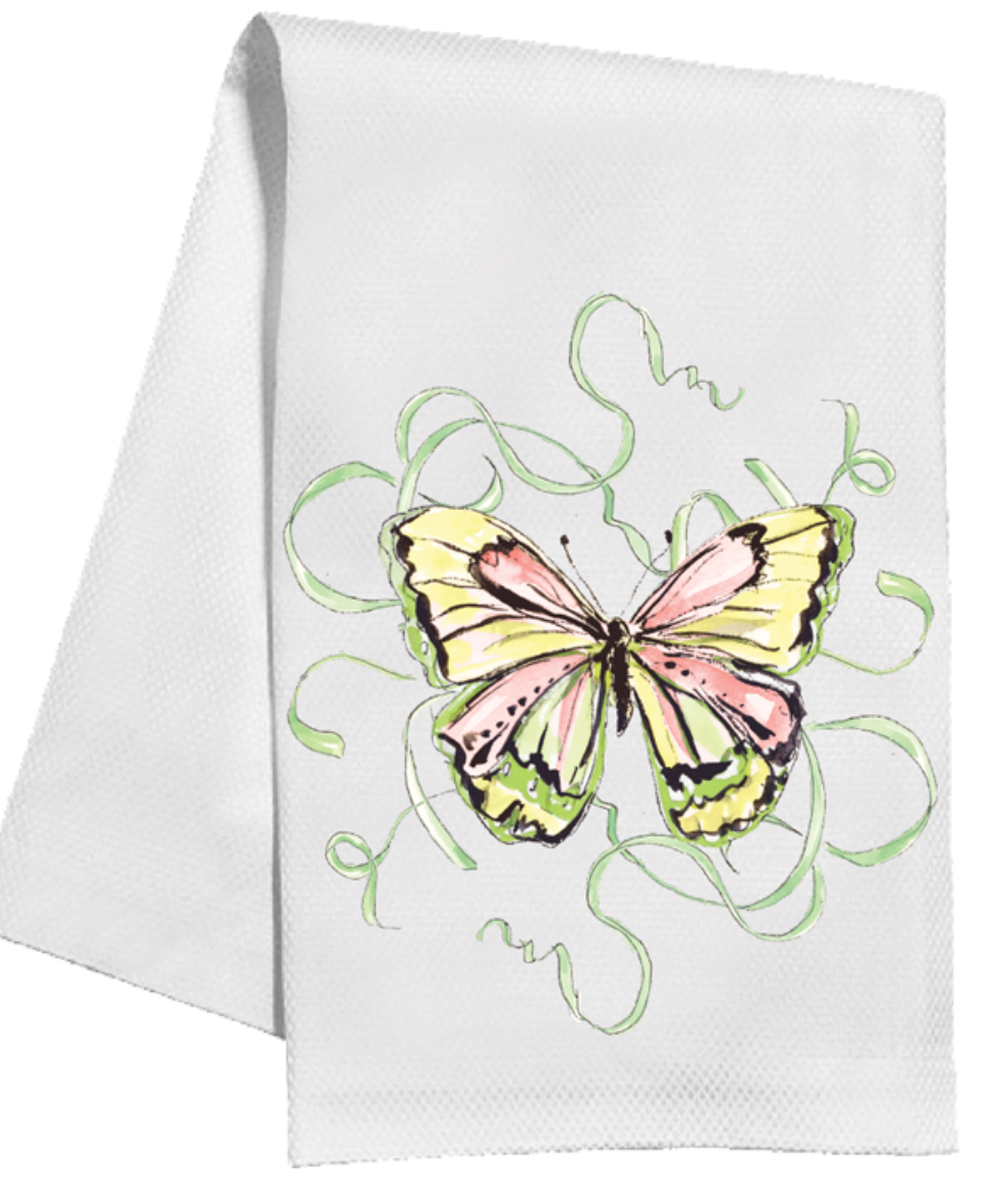 HANDPAINTED GARDEN PARTY GREEN & CORAL BUTTERFLY KITCHEN TOWEL