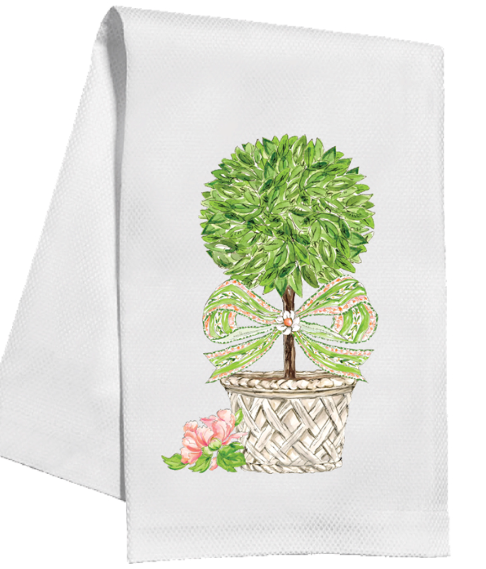 HANDPAINTED GARDEN PARTY TOPIARY WITH GREEN & CORAL BOW KITCHEN TOWEL