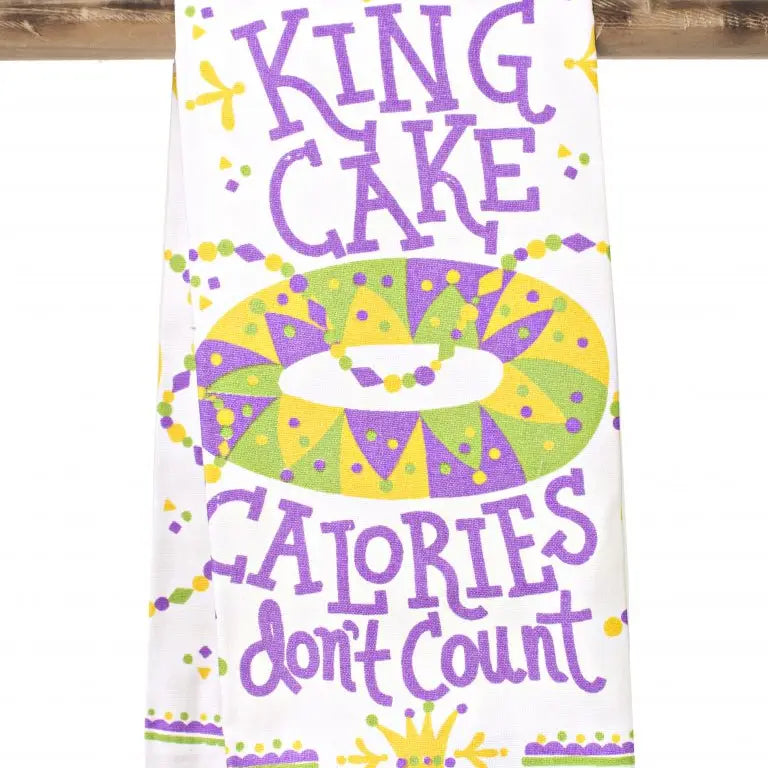 A colorful tea towel featuring the saying “king cake calories don’t count”. Artwork features a King Cake with Mardi Gras beads throughout. 100% cotton measures 26″ tall, 17″ wide when unfolded Hidden loop on the back for easy hanging