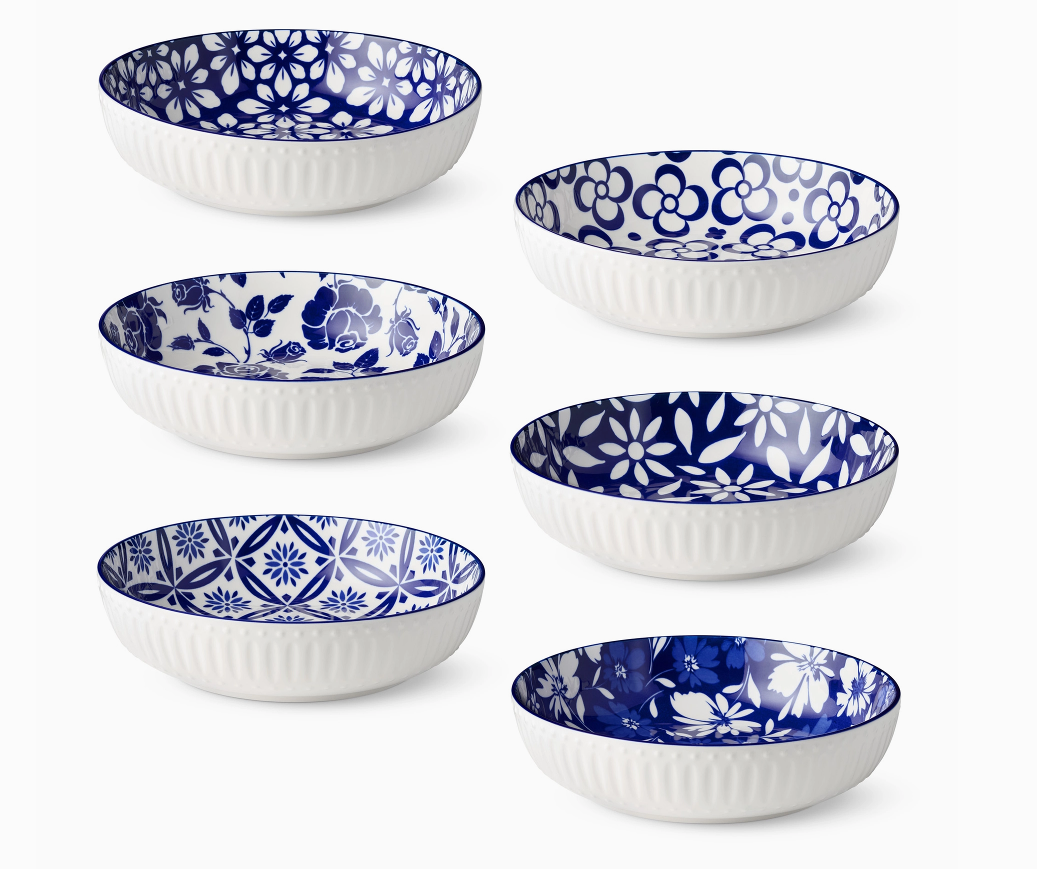 Transform your dining table with the Madison Soup Bowls, a perfect blend of functionality and style. Each bowl is crafted from premium porcelain and features a ribbed exterior that adds texture and sophistication. The vibrant blue and white interior designs showcase intricate floral and geometric patterns, creating a striking contrast with the classic white exterior. With a generous 48 oz capacity, these versatile bowls are ideal for serving soups, stews, pastas, salads, or hearty grain bowls. Their ample size and elegant design make them perfect for casual family meals, festive gatherings, or entertaining guests. Designed for modern convenience, these bowls are microwave-safe for quick reheating and dishwasher-safe for easy cleanup, ensuring practicality and elegance go hand in hand. Pair them with other pieces from the Madison collection for a cohesive table setting, or gift them to loved ones for a thoughtful and stylish present.
