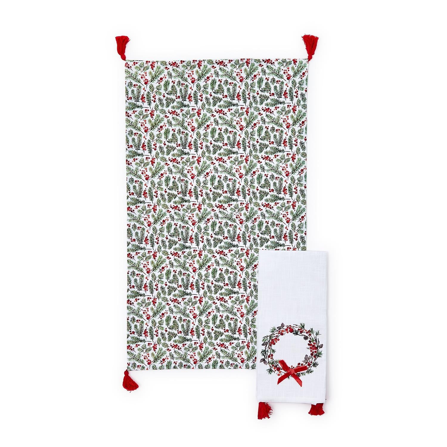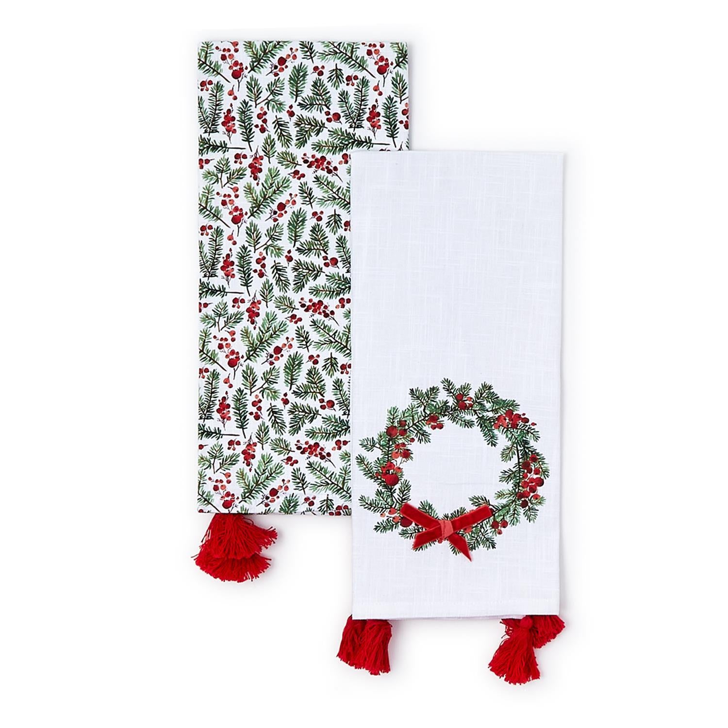 Made from soft and absorbent cotton, each set of our Merry Berry dish towels features a towel with wreath and velvet bow accent, and an all over printed towel. The contrasting red tassels add a whimsical and elegant touch, making them a perfect addition to your kitchen during the holidays.