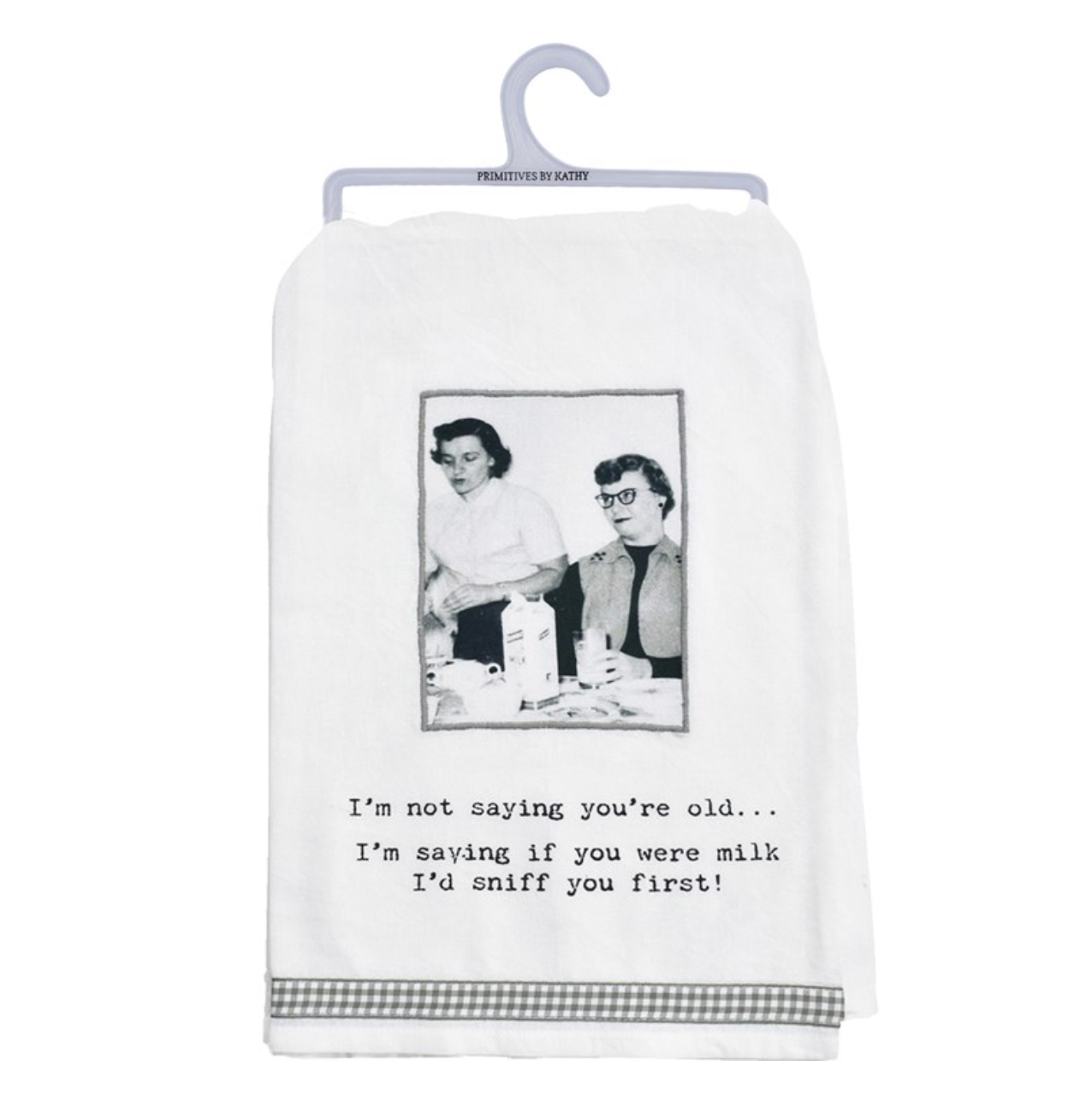 A cotton kitchen towel from our Trash Talk by Annie Collection features a stitched art panel with vintage photograph, "I'm Not Saying You're Old…I'm Saying If You Were Milk I'd Sniff You First!" sentiment, and gingham ribbon trim. Our Not Saying kitchen towel is machine-washable.