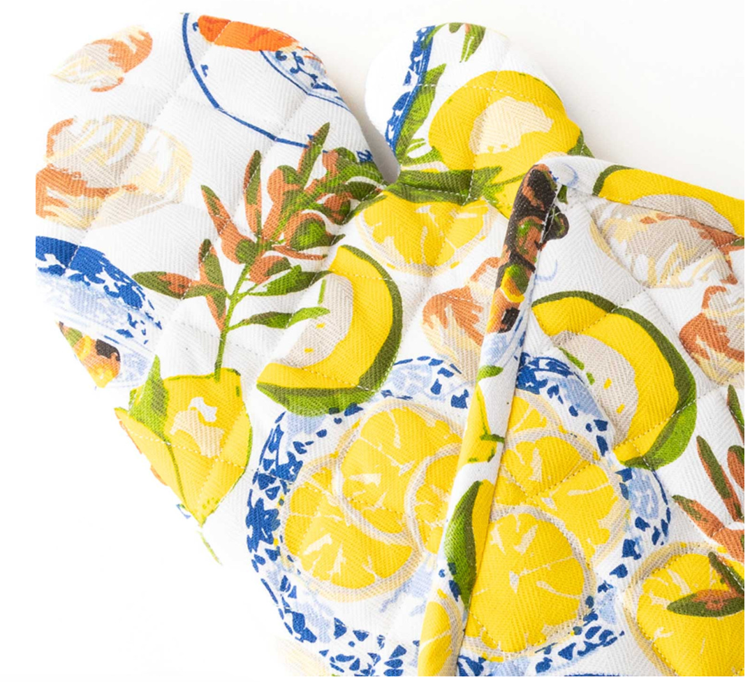Bring the feeling of natural beauty & timeless elegance into your kitchen with our Lemon Santorini Oven Mitt Set. Get ready to feel stylish while cooking with this set & its signature orange blossom print - perfect for adding a flair of sophisticated charm to any kitchen. Crafted from 100% cotton, you know youre getting nothing but the best in quality & comfort. Plus, each mitt & potholder also come complete with a hanging loop for easy storage when not in use! Make sure to pair this beautiful oven mitt set with our Kitchen Towels & Aprons to create a wonderful gift for someone special or just use them as the perfect way to celebrate yourself!