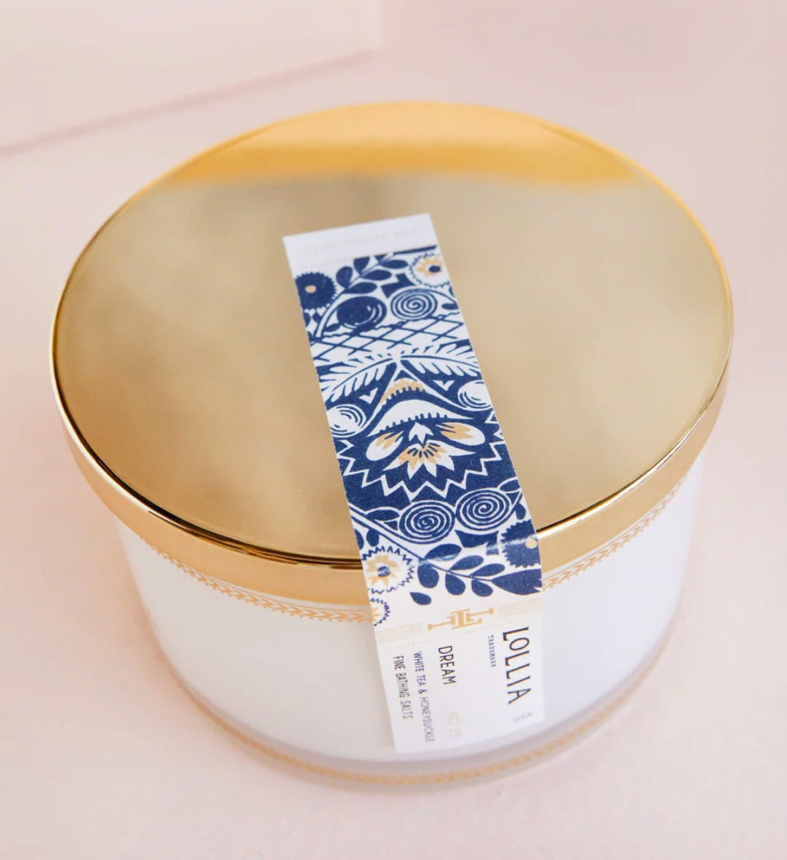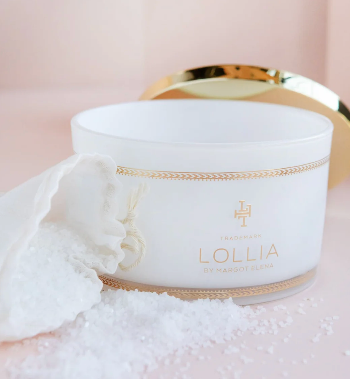 Embrace an elegant escape. Melt your worries away with a luxurious sea salt soak that’s delightfully fragranced & richly relaxing. Soothing the senses with uplifting notes of Linden, White Tea, and Honeysuckle, this blissful bath time retreat leaves skin silky soft and the mind rejuvenated.
