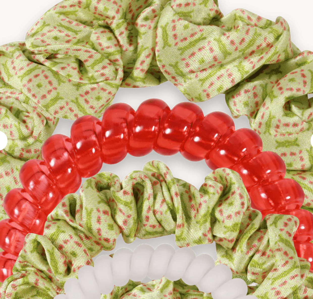 Berry Cozy Mix Pack Hair Ties in Green, Red, and White offer a strong grip without damage, doubling as a stylish bracelet when not in use. The TELETIES x Laura Park Holiday Collaboration features bold, playful designs that combine Laura’s vibrant art with TELETIES signature function.