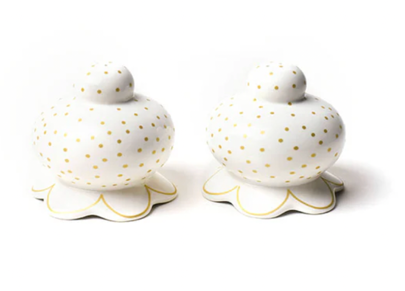 From the Deco Gold Collection by Coton Colors, this salt & pepper set features: