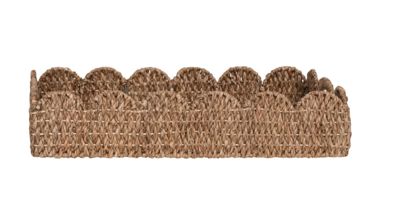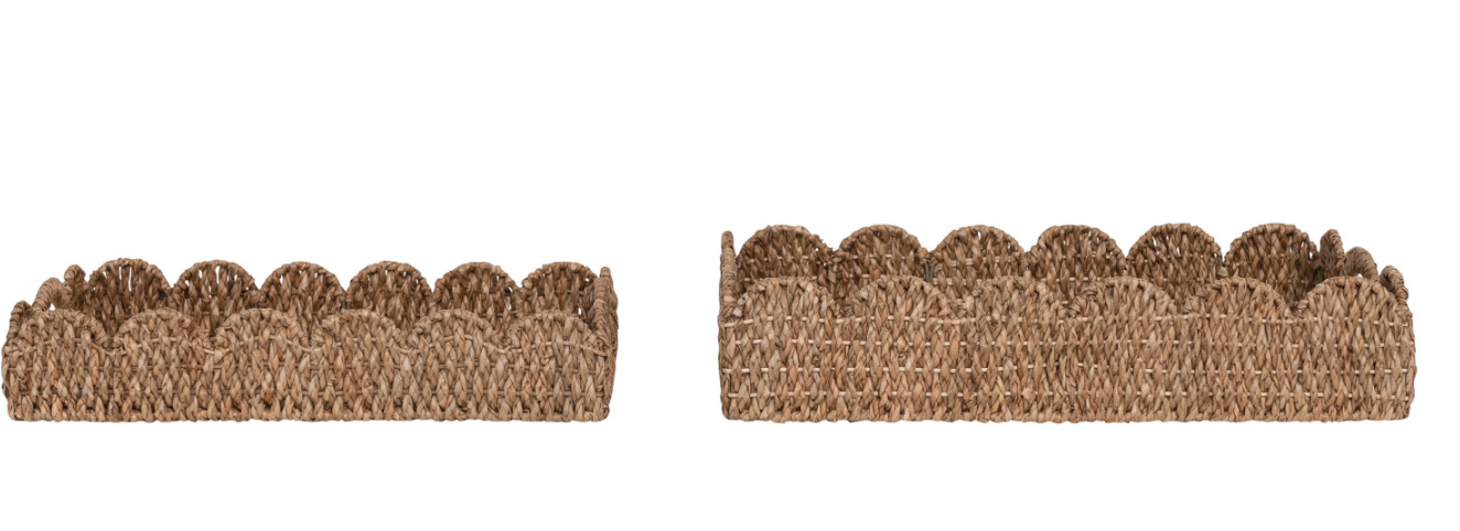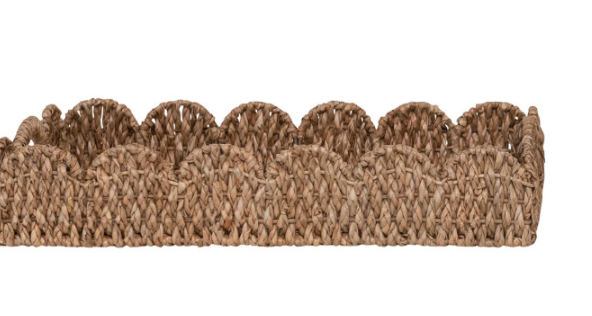 Elevate your table styling with these charming braided bankuan trays, handcrafted with natural woven texture and practical handles for easy transport. The delicate scalloped edge adds an elegant finishing touch, making them perfect for serving snacks, organizing décor, or displaying items at parties and gatherings. Their versatile neutral tone complements any aesthetic, while the sturdy construction ensures lasting durability. Ideal for both everyday use and special occasions.