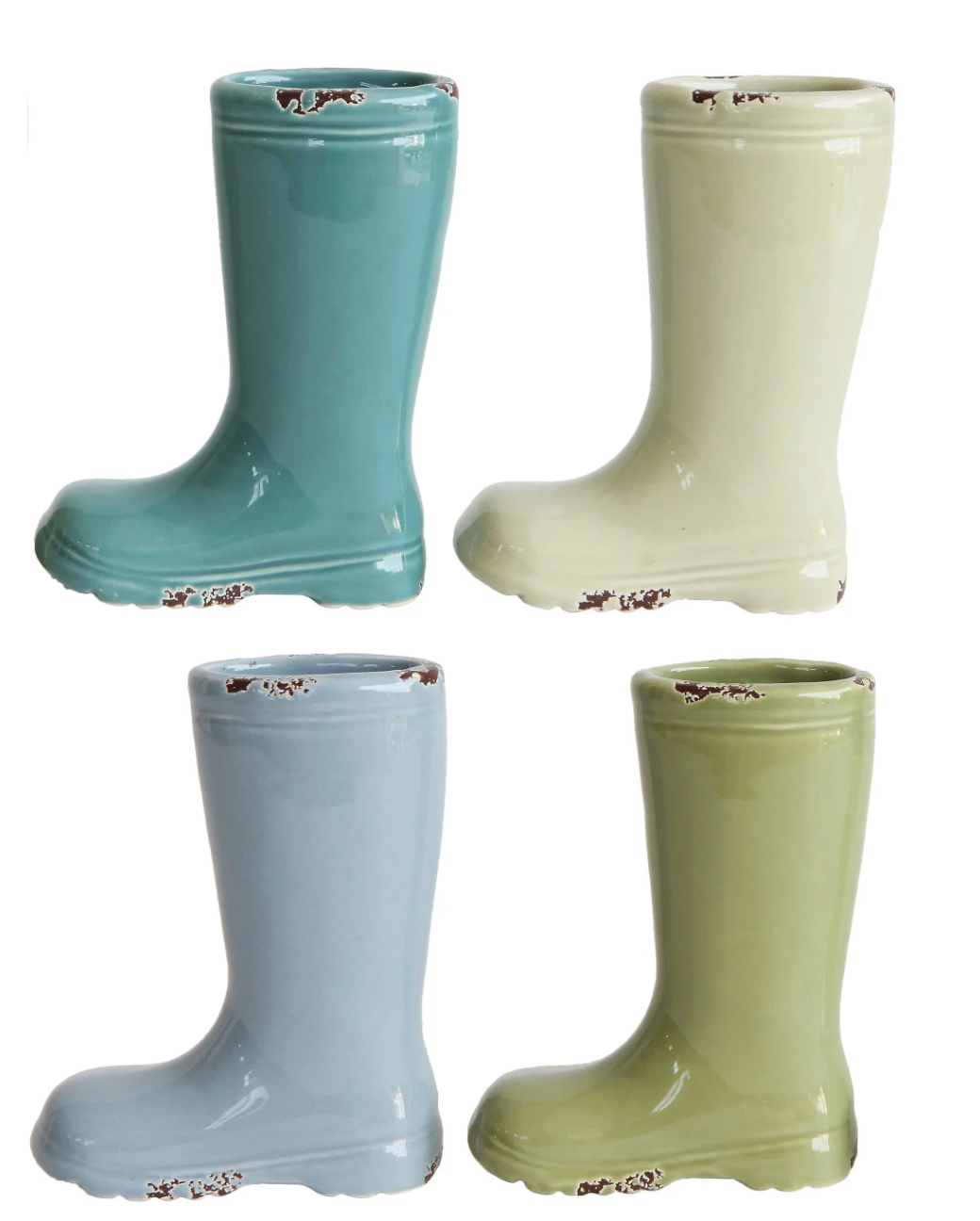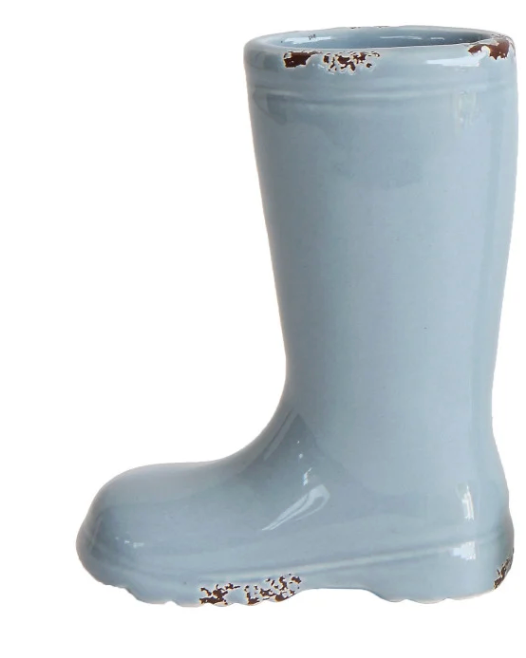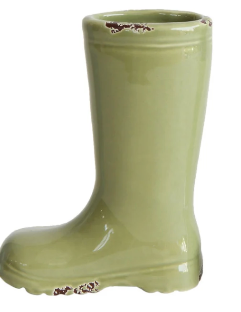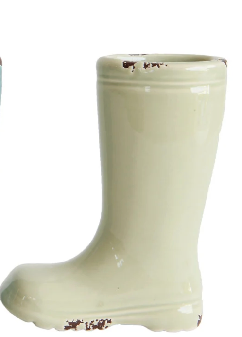Charming stoneware boot vase with a beautifully distressed finish that adds rustic character to any space. Perfect for displaying fresh or dried flowers, this unique piece combines vintage appeal with practical functionality. The weathered texture and classic boot silhouette make it an ideal accent for farmhouse, cottage, or eclectic décor styles. A delightful conversation starter that brings warmth and whimsy to shelves, mantels, or tabletops.