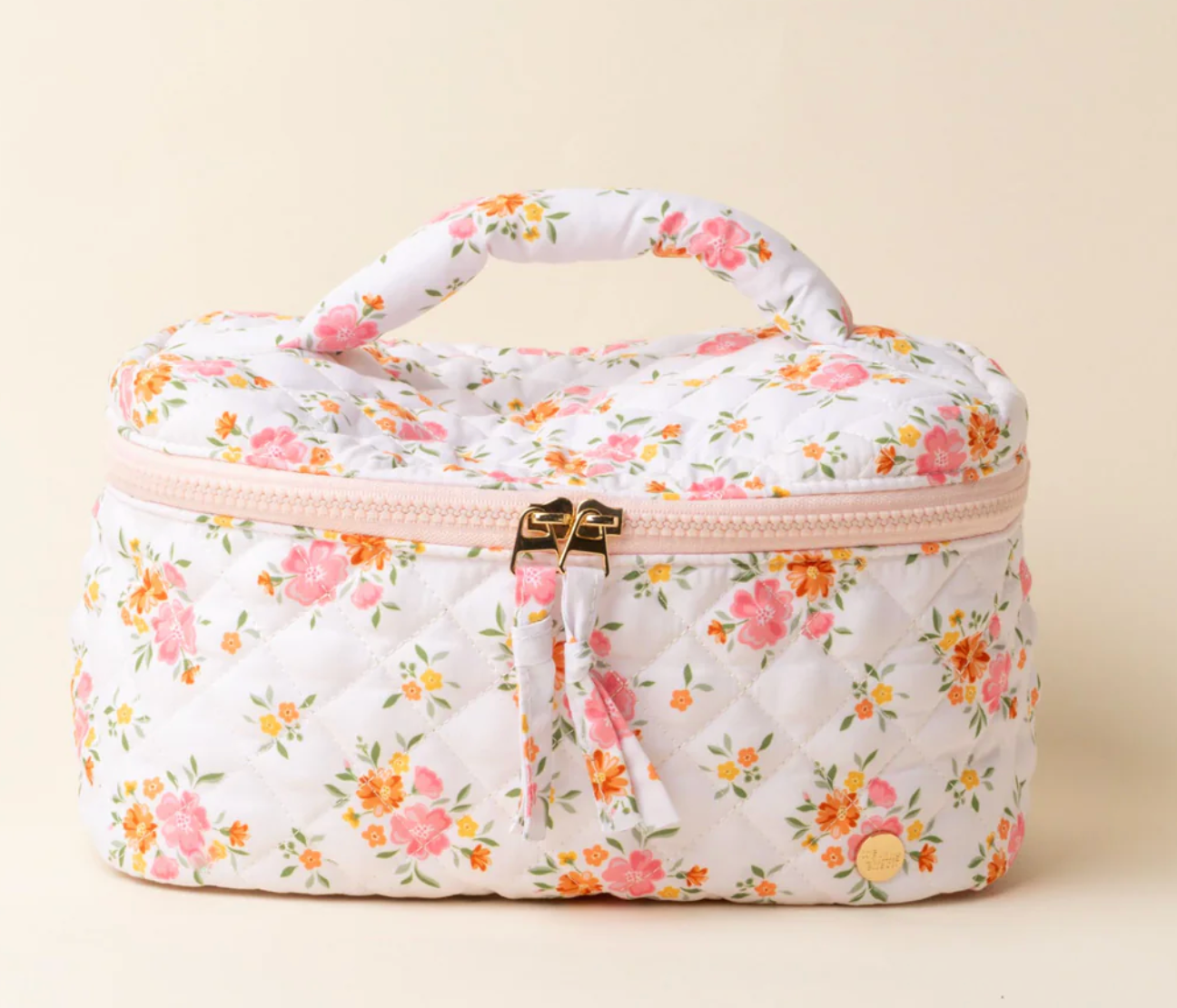 Simplify your beauty routine with our Glam & Go Quilted Cosmetic Bag. Crafted from soft, quilted fabric and equipped with a convenient handle, this bag features an all-around gold double zipper for easy access. Inside the bag is our signature interior lining that is wipeable and water-resistant—keeping everything easy-to-clean and tidy. It's perfectly sized to carry your must-haves, whether you're traveling, running errands, or just need a stylish way to keep your essentials in place.