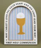 Celebrate a sacred milestone with this beautifully crafted First Communion Picture Frame. Made from smooth, high-quality enamel, this arched frame features a gold chalice and host illustration on a soft blue striped background. The words “May Christ’s love fill your heart and His light lead your way” wrap around the arch, offering a meaningful blessing. At the base, “First Holy Communion” is boldly inscribed to mark this special day. Perfect for displaying a 5x7 photo of your child’s First Communion, this frame makes a heartfelt gift from godparents, grandparents, or parish communities. Details: * Enamel and metal construction with gold-tone accents * Freestanding arched design * Fits a 5x7" photo * Dimensions: 6.5x8.5inches A keepsake to treasure for years to come.
