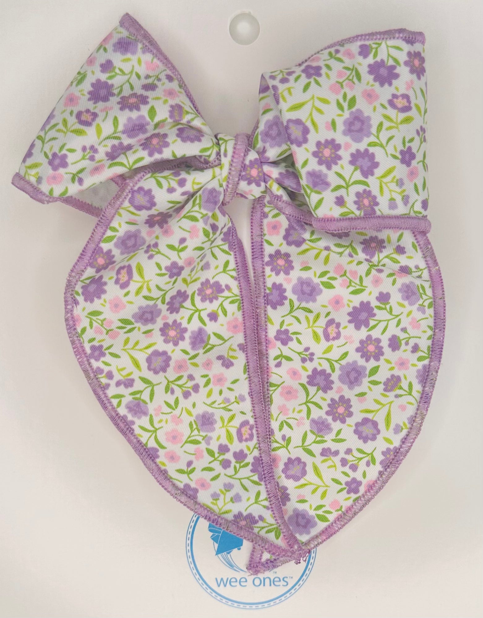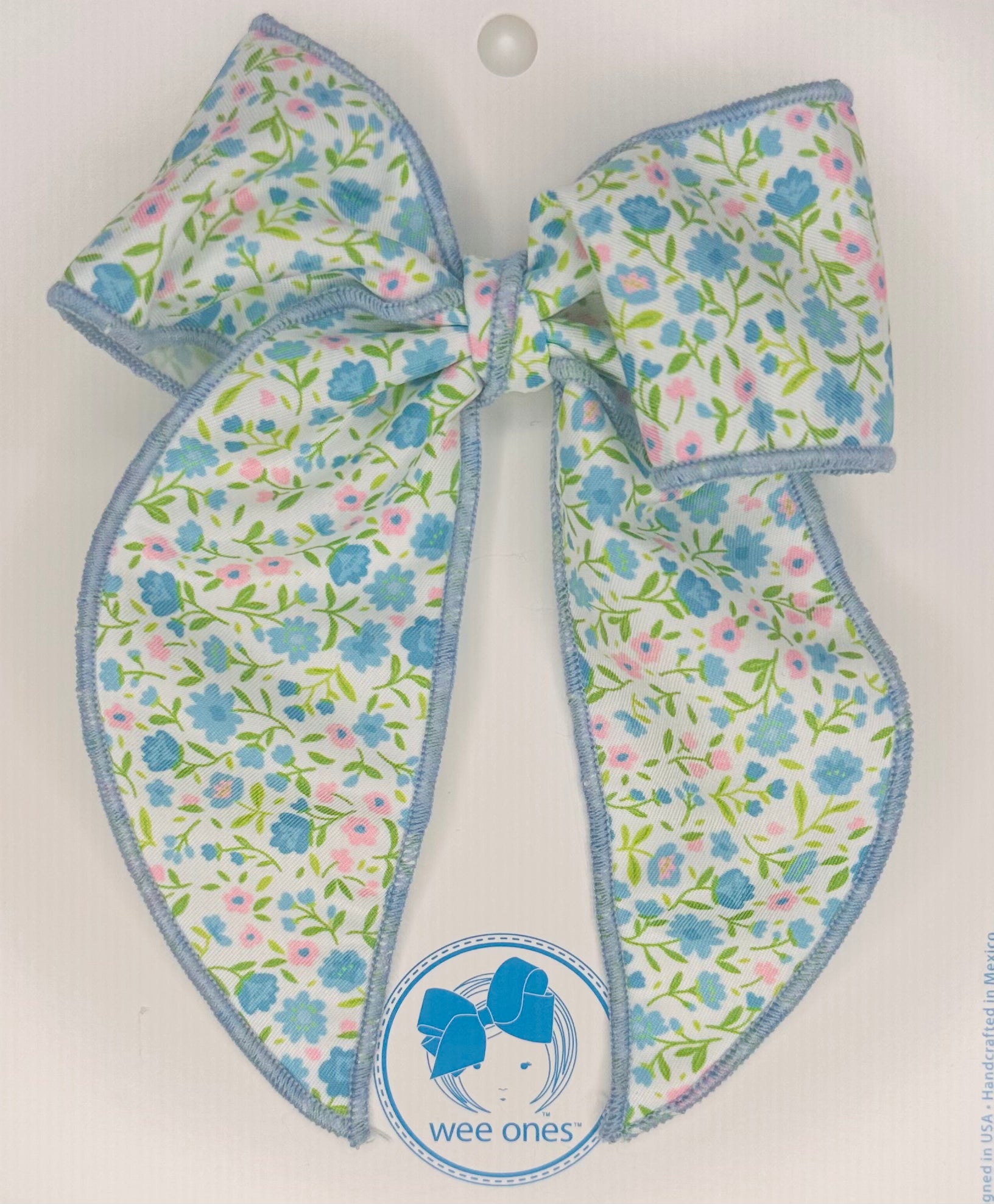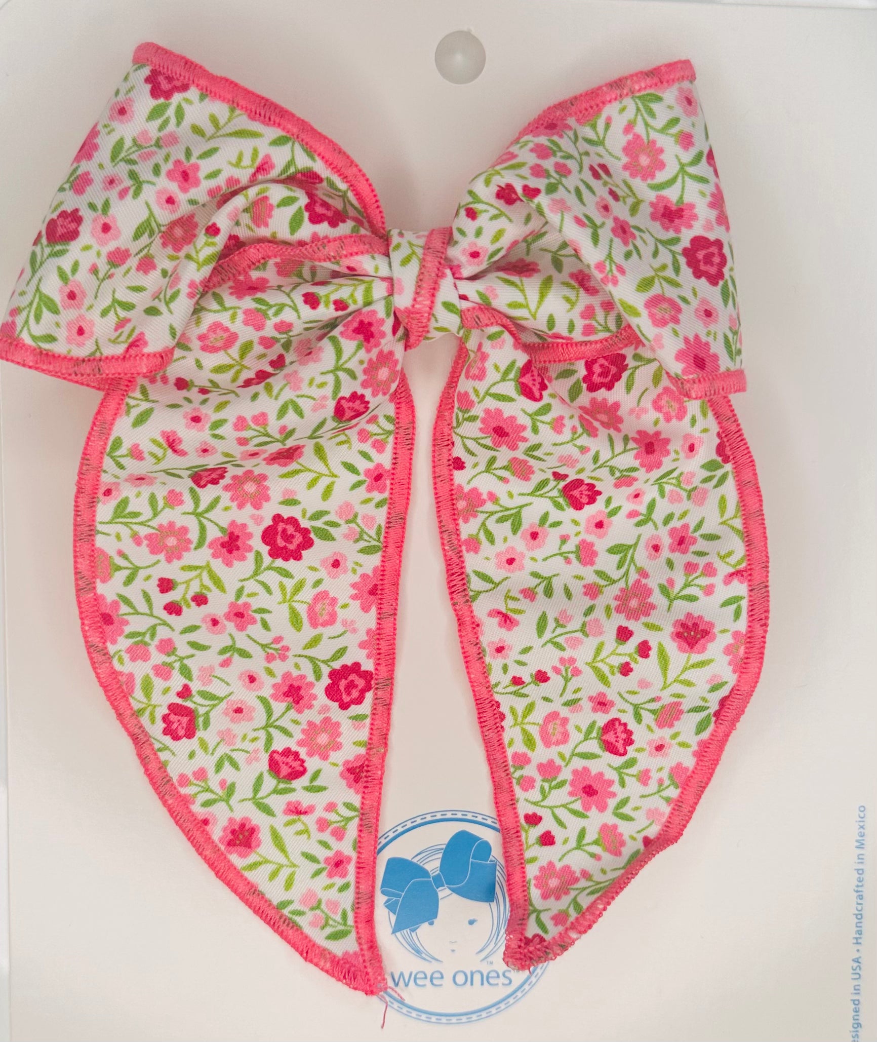 Top off her Spring outfit with a festive Floral Print Fabric Bow with solid edging! An accessory that is sure to delight. This bow is sure to stay in her hair all day with our patented WeeStay™ no-slip hair clip.