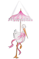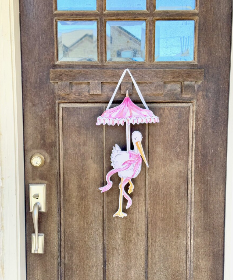 Announce her arrival in the sweetest way with the Girl Stork Door Hanger. This charming decoration features a sweet stork carrying a pink parasol, perfect for celebrating a new baby girl. Made from lightweight, durable PVC, it’s ideal for hanging on doors, walls, or nursery entrances. Measuring 10.5" x 0.5" x 22", this whimsical piece makes a delightful gift or shower decoration.