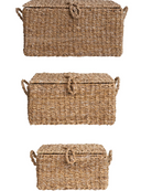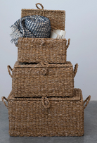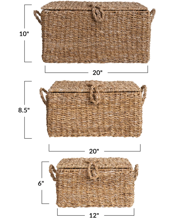 This handwoven seagrass and wire-framed trunks are a beautiful set that will enhance any living space. The set includes three trunks of different sizes with a rectangular shape and a natural finish. The trunks are handwoven by skilled artisans using seagrass, a sustainable and eco-friendly material with a soft texture and a natural color. The trunks also have a wireframe that adds some strength and structure to the piece. The trunks have a rustic and natural look that blends well with any home décor, especially in the farmhouse or coastal style. Use them to store or display textiles, books, accessories, or other items in the living room, bedroom, or entryway. The trunks can also be decorative boxes that add personality and style to the mantelpiece or console table. The trunks measure 20 inches length x 14 inches width x 10 inches height, 16 inches length x 10.5 inches width x 8.5 inches height, and 12 inches length x 8.5 inches width x 6 inches height, making them a perfect set for any room. These trunks are a wonderful way to curate a space that reflects unique style with intentionally designed home décor. A farmhouse-influenced set of storage trunks that showcases masterfully handwoven seagrass around a durable wire frame. Ideal for adding some rustic and natural charm to any living space, from farmhouse to coastal. A versatile set of trunks that can be used to store or display textiles, books, accessories, or other items. Made of seagrass and metal, creating a sturdy and eco-friendly combination of materials. *sold separately*