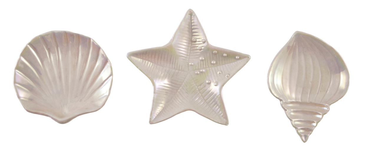 Bring coastal charm to your table with this enchanting stoneware dish, crafted in whimsical shell and starfish shapes. The shimmering iridescent finish catches the light beautifully, creating an ever-changing play of colors that adds elegance to any space. Perfect for serving appetizers, displaying jewelry, or adding a decorative touch to shelves and nightstands. Durable stoneware construction ensures lasting quality. An ideal gift for beach lovers and those who appreciate unique, nature-inspired home décor.