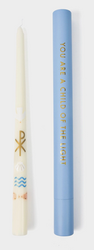 A vibrant celebration of new life in Christ, our Living Water Baptism Candle features a joyful design inspired by early Christian art. * The Chi-Rho symbolizes Christ, the Light of the World. * The dove represents the Holy Spirit descending in peace and blessing. * The shell evokes the sacred waters of Baptism. * The waves symbolize the living water promised by Jesus (John 4:14). * The fish recall the earliest Christians, who used the fish as a sign of faith. This candle is a beautiful way to mark a baptism with rich symbolism, color, and joy—a cherished keepsake to remember the important sacrament. Each tapered Baptism candle comes beautifully packaged in a keepsake storage tube, thoughtfully designed to protect the candle. “You are a child of the light” is written in elegant gold foil.