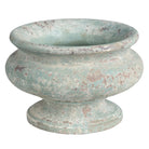 Our new pottery, Orleans collection, has a pale blue green weathered finish. The Orleans Footed Low Urn Medium is a great size for potted plants and florals.