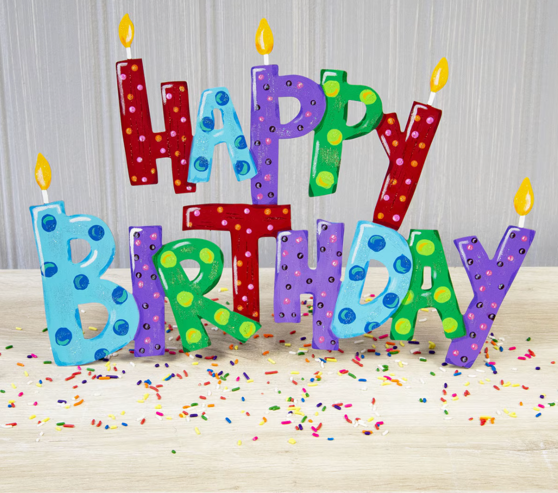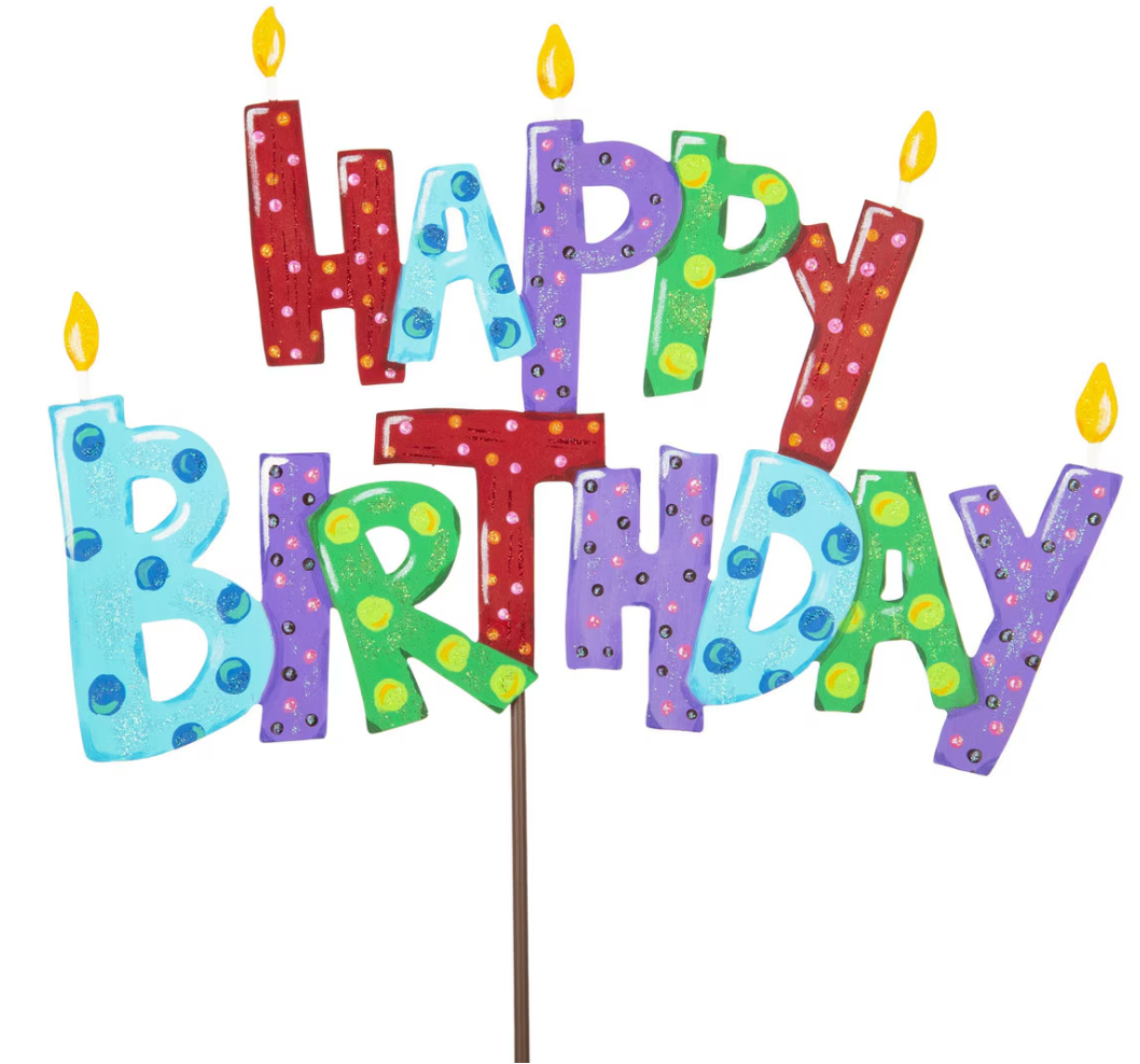 Celebrate in colorful style with the Pile of Happy Birthday Yard Sign from the Round Top Collection. This festive metal sign features a whimsical stack of birthday candles with bold lettering spelling out "Happy Birthday" in cheerful colors. Designed to add instant party charm, it measures 16" x 0.5" x 11" and is perfect for front yards, garden beds, or party entrances. A fun and reusable way to mark any birthday celebration with joy and personality!