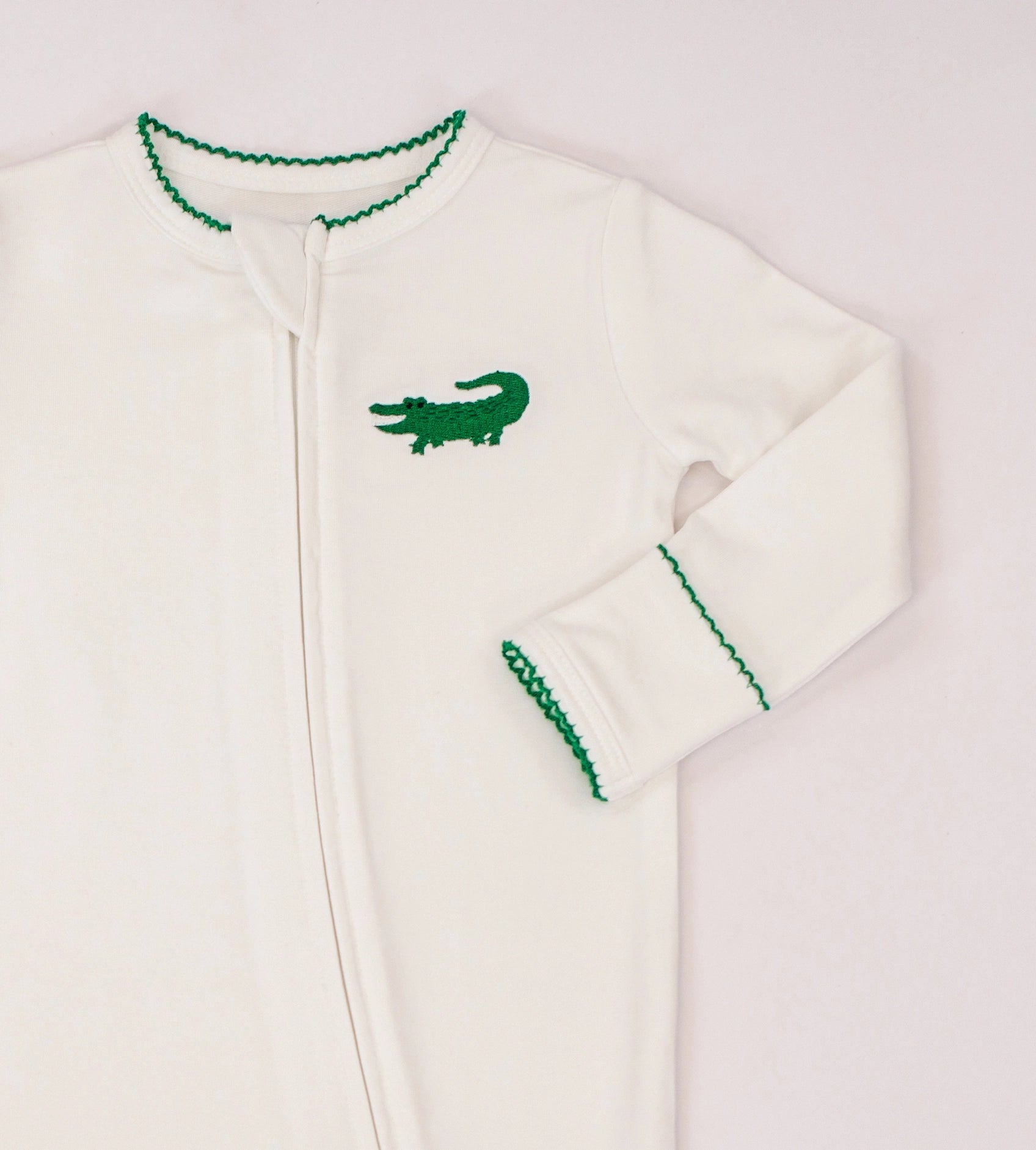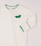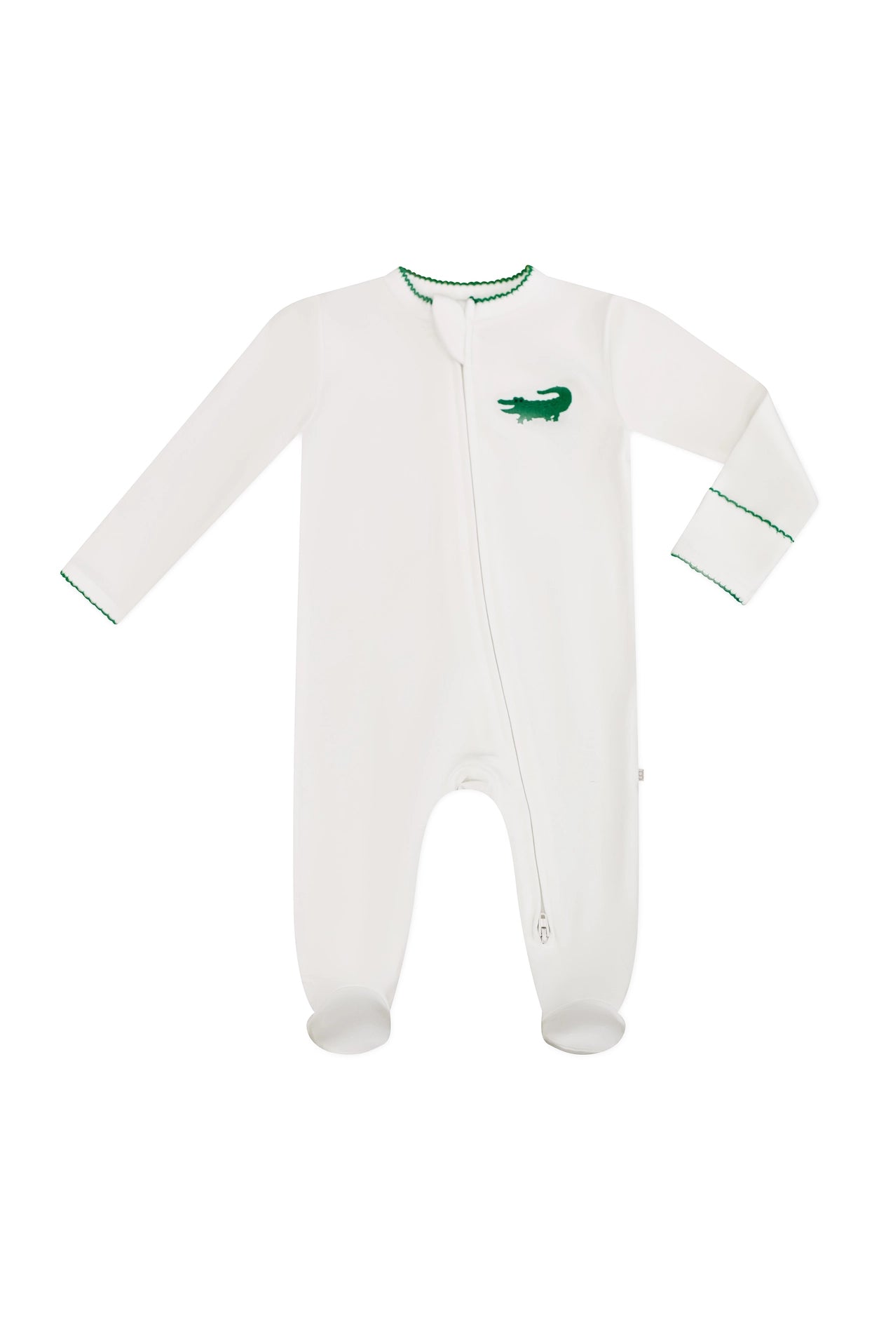 Details: • 95% Bamboo Viscose, 5% Spandex French Terry fabric • Footed, full-length zip romper • Embroidered detail at chest • Contrast picot trim at neckline & cuffs •