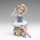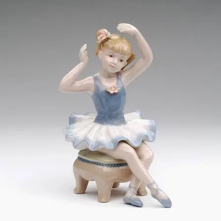 This 5.5 inch porcelain figurine of an exuberant young dancer is an adorable addition to your porcelain ballet collection! In a baby blue tutu, she is situated upon a cute stool, waiting eagerly to go to the big recital. Her arms extend above her head, reaching to check her pigtail, or for a quick stretch to stay limber. Her darling pigtails complete the overall appeal. A fun ballerina figurine, this piece makes a wonderful companion with any of our ballerina porcelain pieces. Order today for her to join your collection of wonderful ballet gifts.