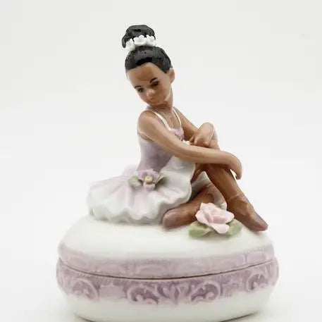 This porcelain ballerina with a purple dress trinket box is a splendid way idea for a gift that will be cherished forever! Cherub-like ballerina rests atop the porcelain trinket box, holding her crossed legs in a coquettish embrace. Glancing slightly over her shoulder, she awaits the cue for her big debut! Elegant ornamental design around the circumference of the trinket box adds a classy touch. Finest Quality Glossy Porcelain is stunning on display. Be sure to give your very best this season with this most beautiful figurine.