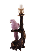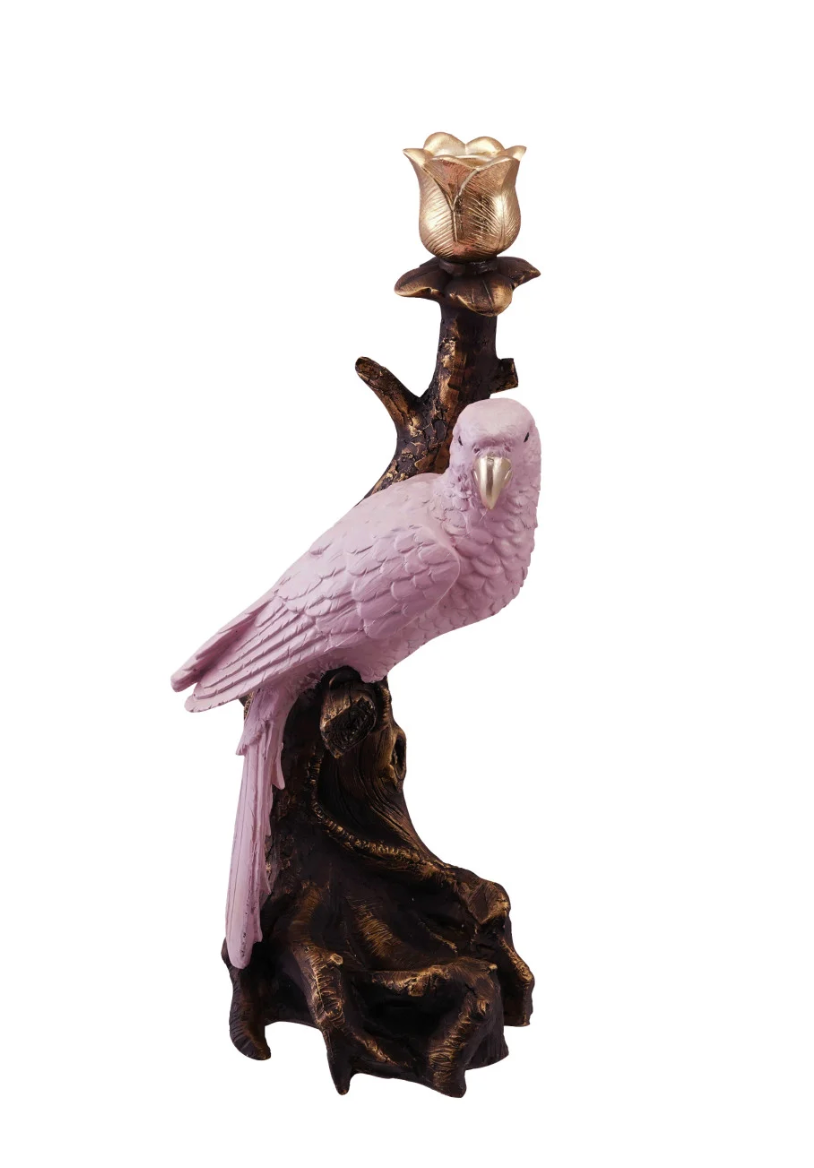 Resin Taper Holder with Parrot on Branch, Antique Gold Finish & Pink