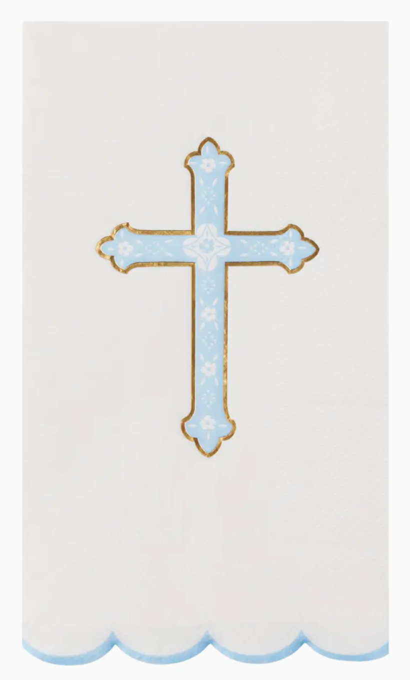 Add refinement to your party table with our Sky Blue Cross Guest Towels. Perfect for baby showers, first communions, and baptisms, these elegant towels pair beautifully with our Dove Sky Blue Small Plates to wow your guests. > Includes 20 party napkins > Size: 4.25" x 7.75" (1/6 Fold - Standard Guest Towel) > Premium soy-based ink > 3-ply paper napkins > Not microwave-safe > FSC-certified paper, eco-conscious materials  > Inspired by the French, Designed in America by Bonjour Fête
