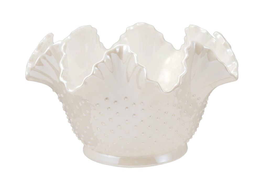 Elevate your table setting with this charming stoneware pedestal, inspired by vintage hobnail design. The delicate ruffled rim and textured hobnail pattern create timeless elegance, perfect for displaying flowers, candles, or serving treats at your next gathering. Crafted with classic appeal, this reproduction piece brings nostalgic sophistication to any space—ideal for parties, events, or everyday décor.