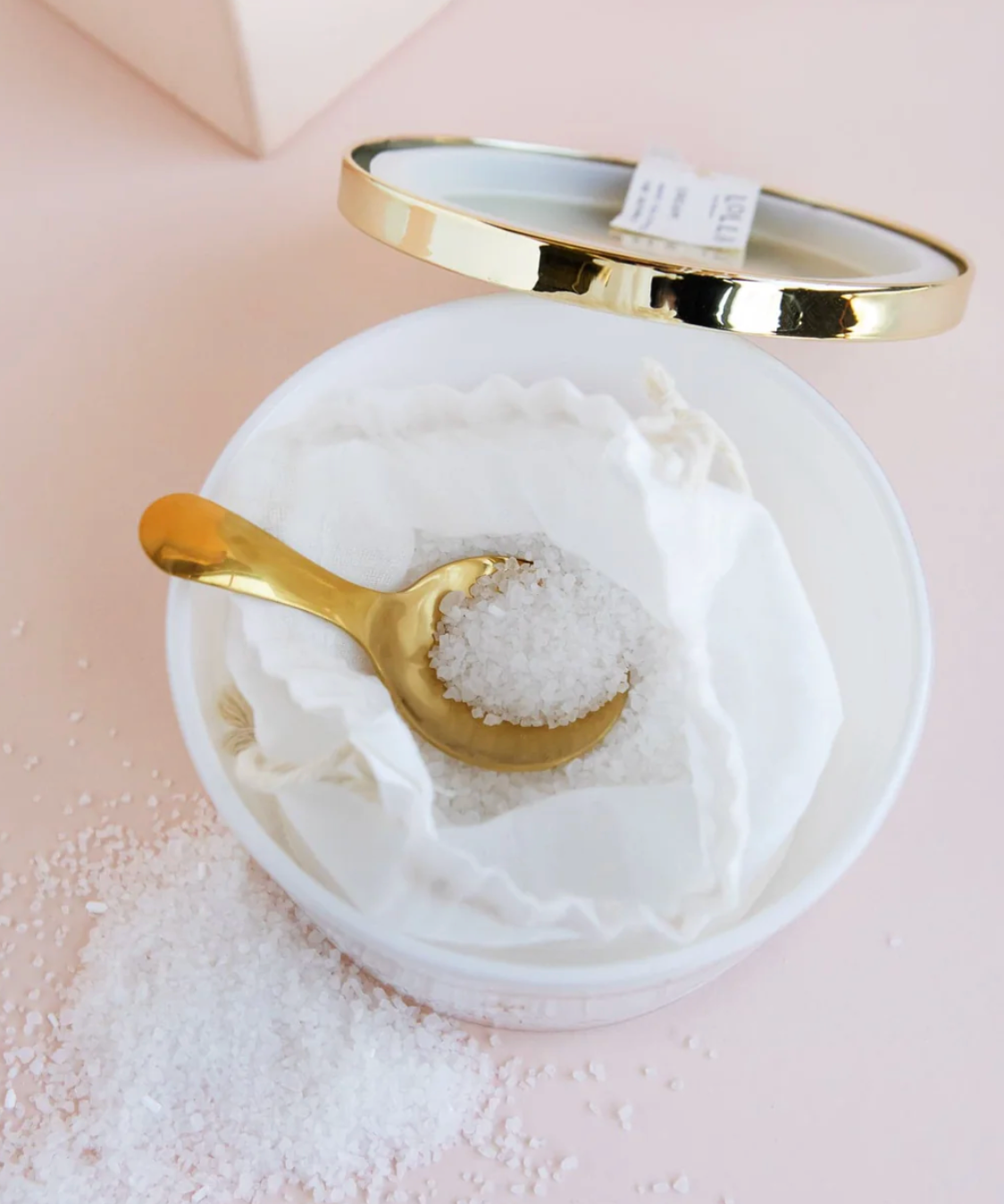 Gold accents and a reflective lid add brilliant shine to this gorgeous glass jar and tub-side keepsake. Inside, a delicate linen drawstring bag holds the luxurious sea salt soak. Dig in with an elegant gold spoon and drift off into a state of bliss. Makes a lovely gift for yourself and others.
