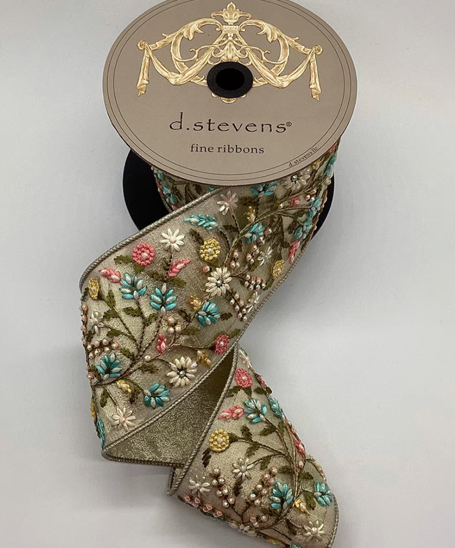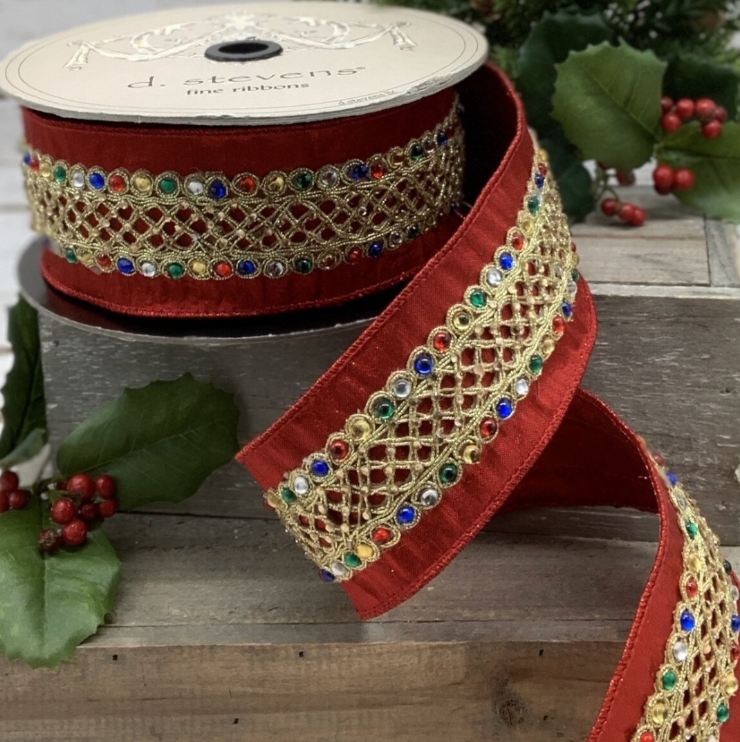 2.5" Faux Red Metallic Dupion With Multicolored Jeweled Trim