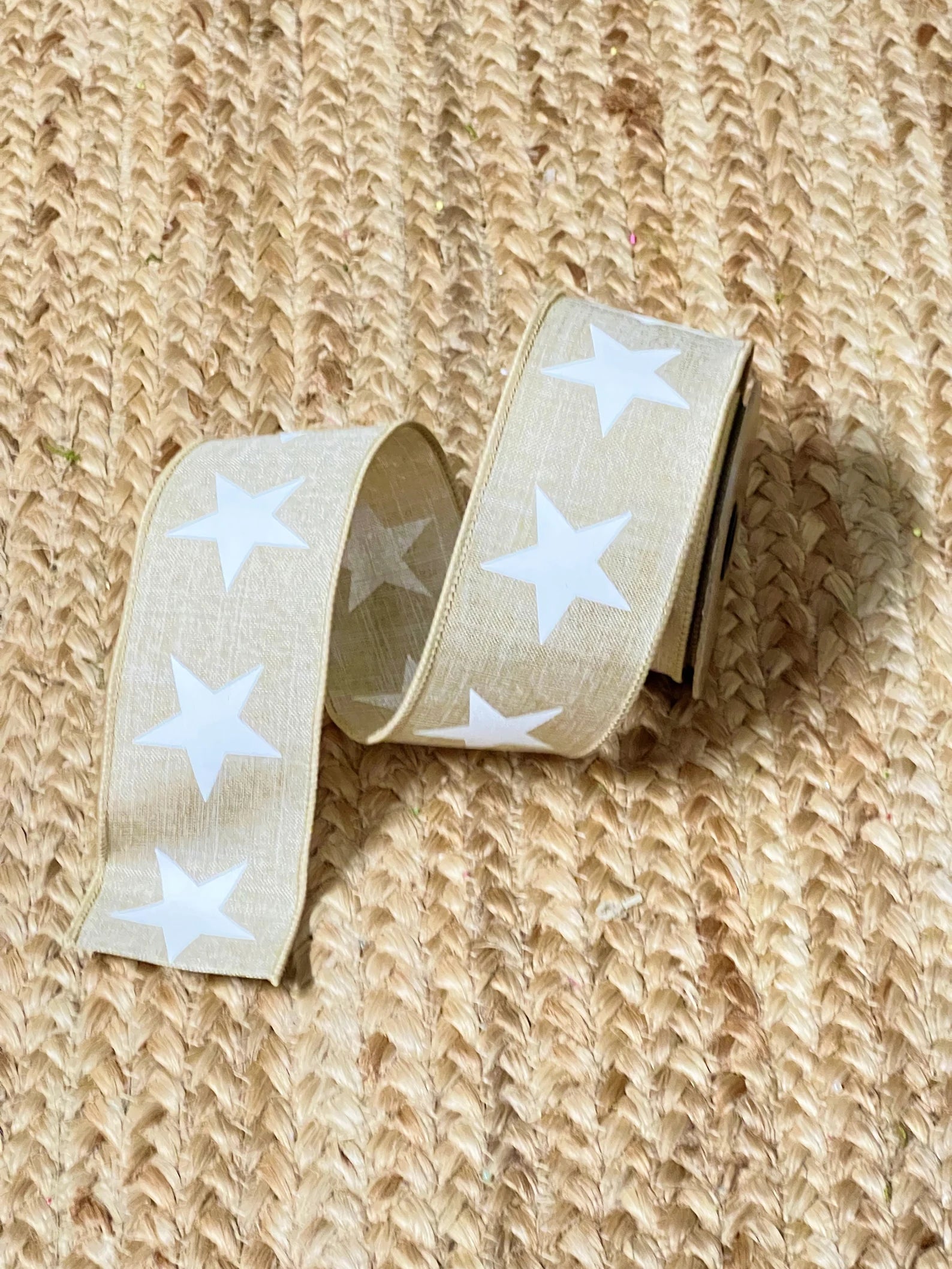 Faux Linen Printed White Stars Natural Ribbon