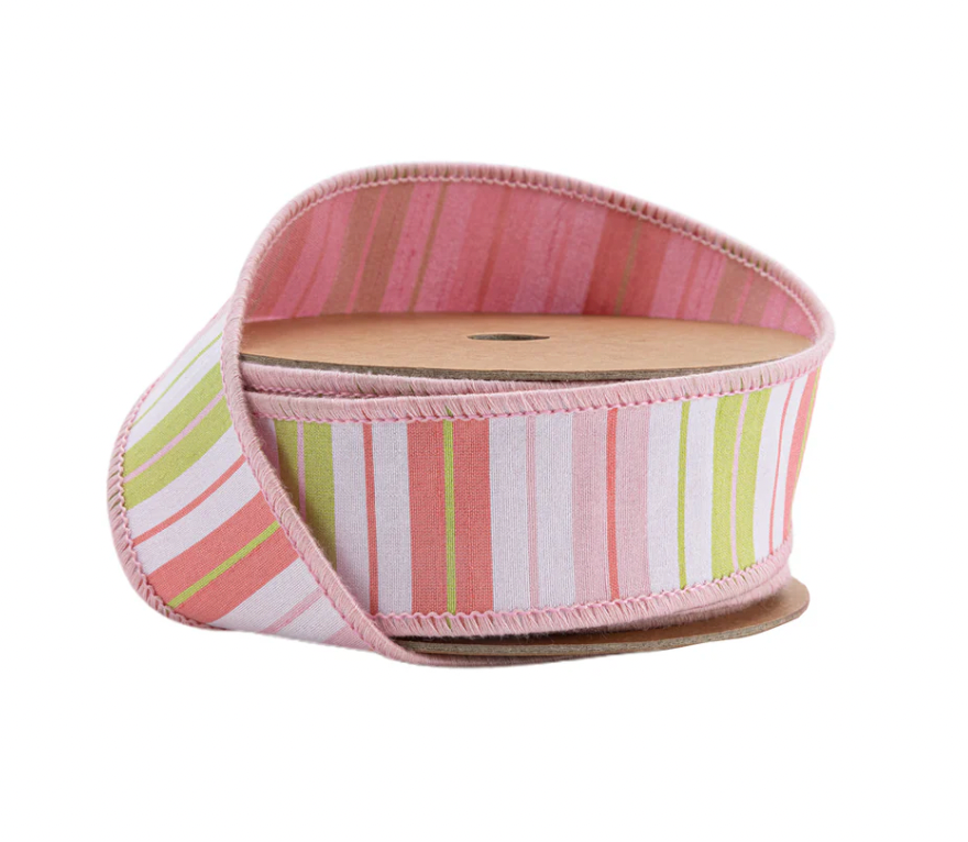 1.5" Wired Ribbon | Pink/Green/White Stripes w/ Pink Backing