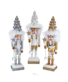 These Hollywood Nutcrackers™ Silver, White and Gold Christmas Tree Hat Nutcrackers are topped with either a silver glittered Christmas tree, a white glittered Christmas tree or a gold glittered Christmas tree. Each nutcracker is holding either a silver glittered star staff or a gold glittered star staff.