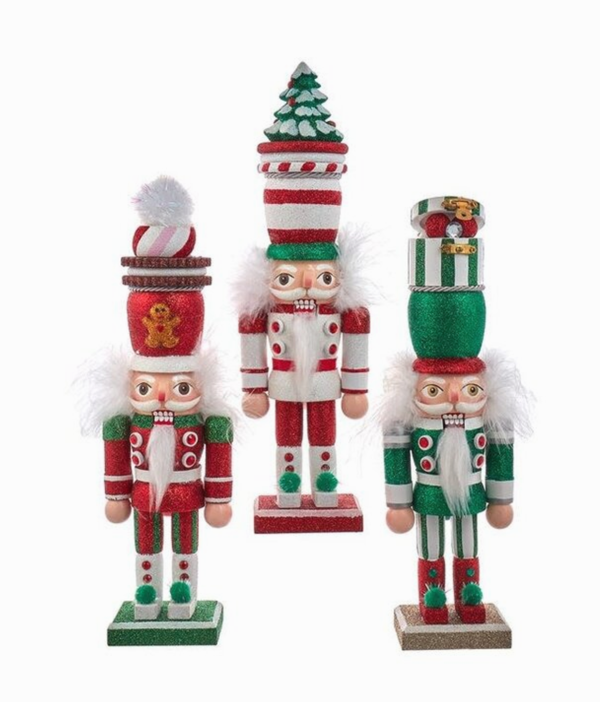 Hollywood Nutcrackers™ is a whimsical collection of nutcrackers created exclusively for Kurt S. Adler, Inc. and features an assortment of designs that put a unique, vibrant, memorable twist on traditional nutcrackers. These 18-inch Red, Green and White Whimsical Hat Nutcrackers are a fun and festive addition to any home or office holiday décor. This assortment features a gingerbread hat nutcracker, a Christmas tree hat and a gift box hat.