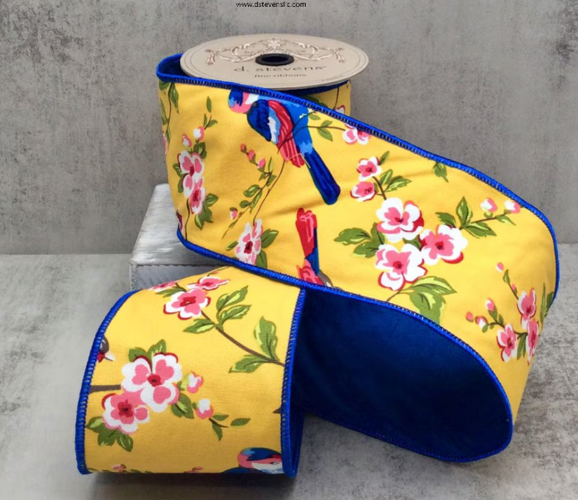 Description: 4" x 10yds canvas blue birds cherry bloosom, golden yellow pink blue