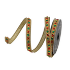 .75" x 5 yards, Red, green and gold ribbon. Ribbon is constructed with thick, wired edge and a secondary fabric to provide shape and structure.