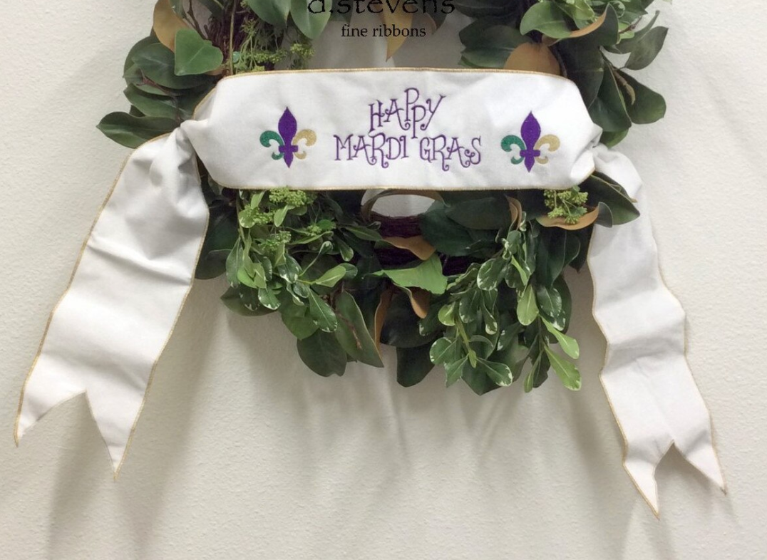 Description: 6" x 70" velvet embroidery happy mardi gras gold back, white purple green