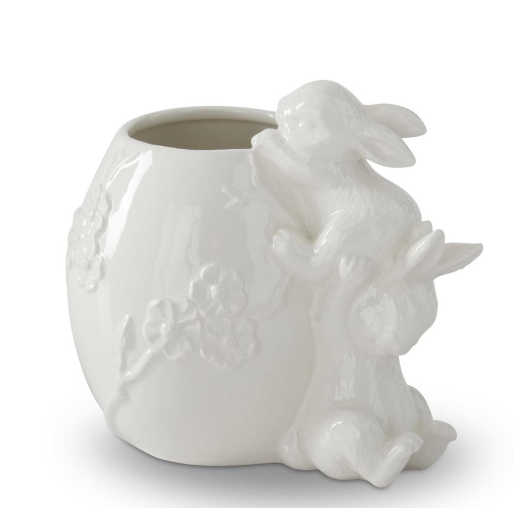 7 Inch White Ceramic Flower Embossed Egg Container w/2 Easter Bunnies