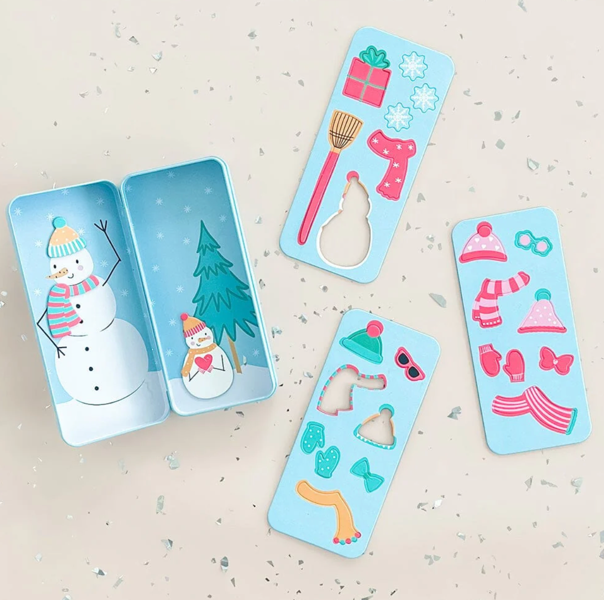 Let's build a snowman! Bundle up and get creative! This game is perfect for on the go. The interior features 2 scenes to build your own jolly buddies right in the box!