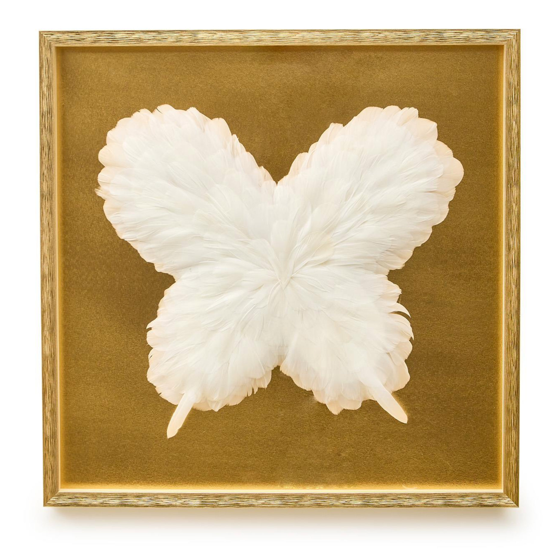Indulge in the whimsical allure of nature with our Butterfly in Feathers Shadow Box Wall Art. Crafted with meticulous attention to detail, this piece features a delicate butterfly adorned with faux feathers, elegantly preserved behind glass in a charming and luxurious gold leaf shadow box.