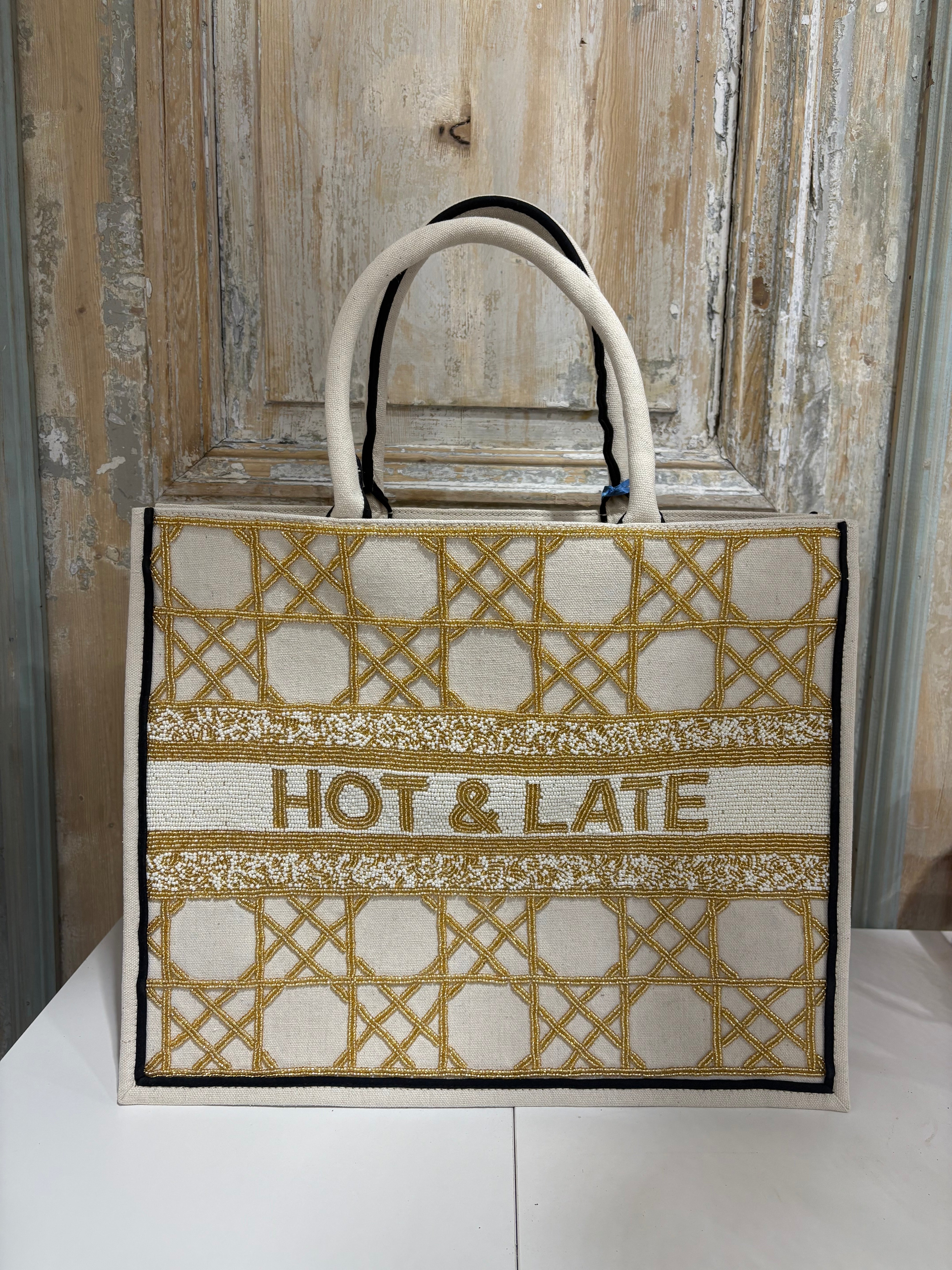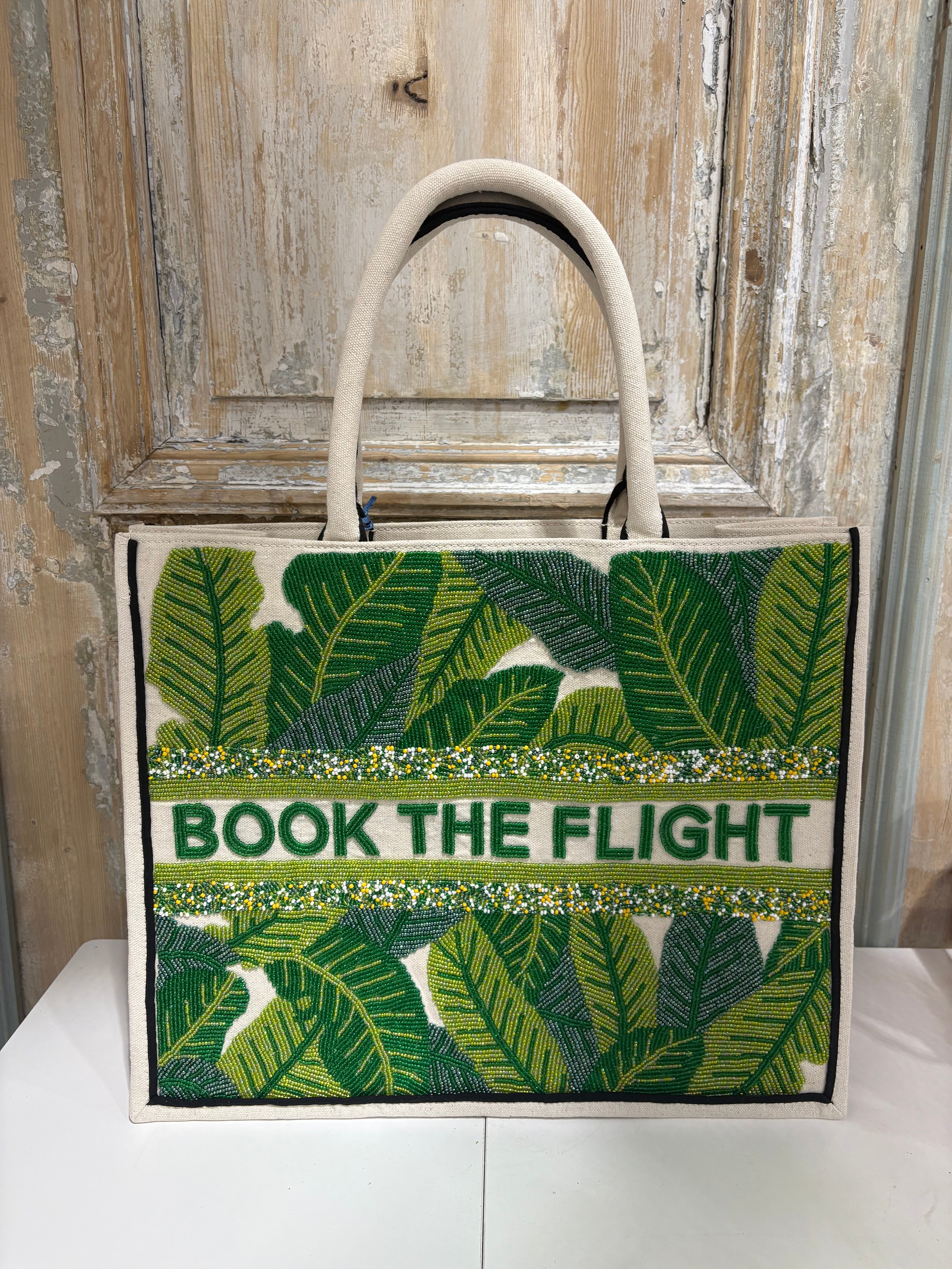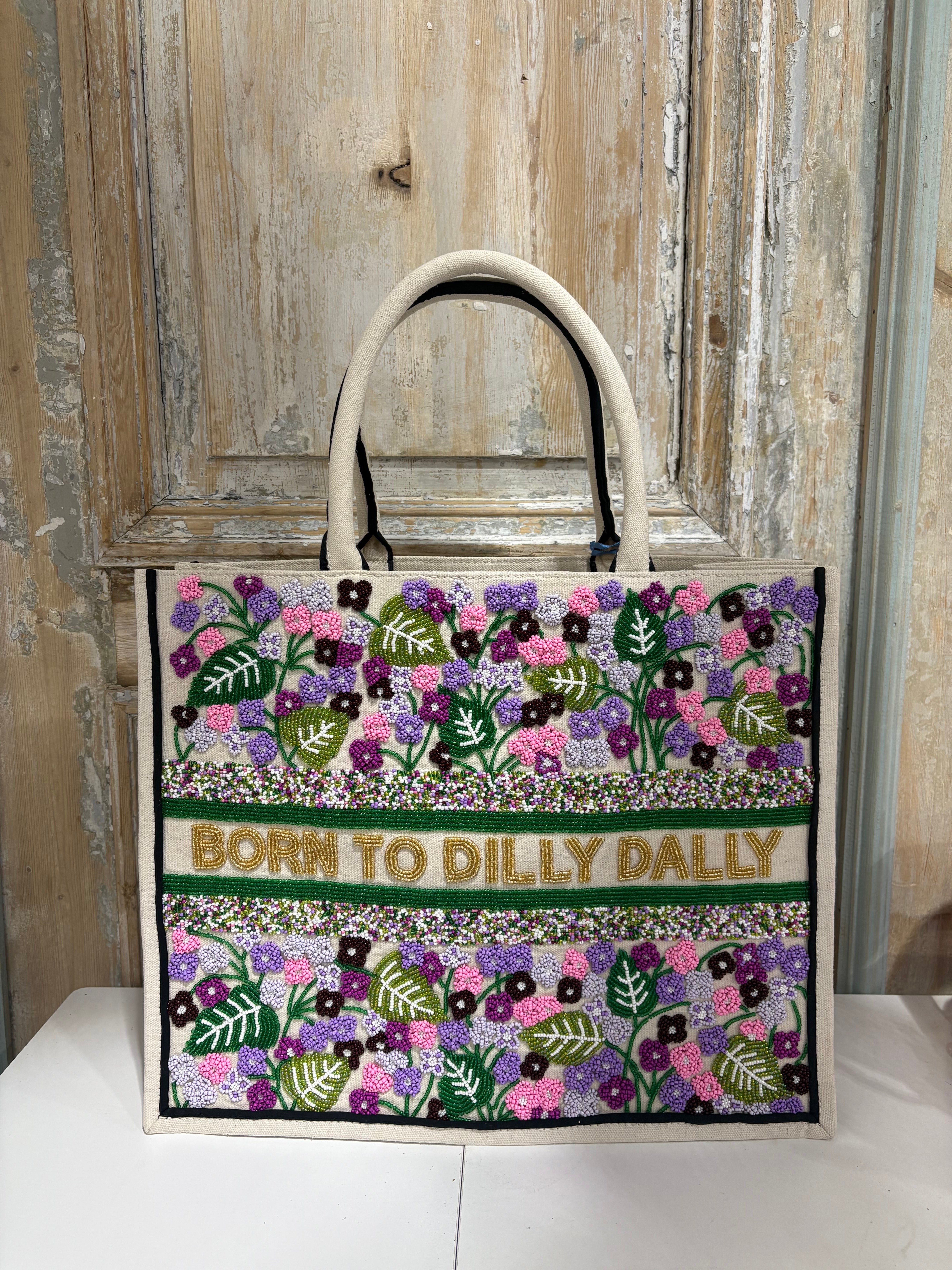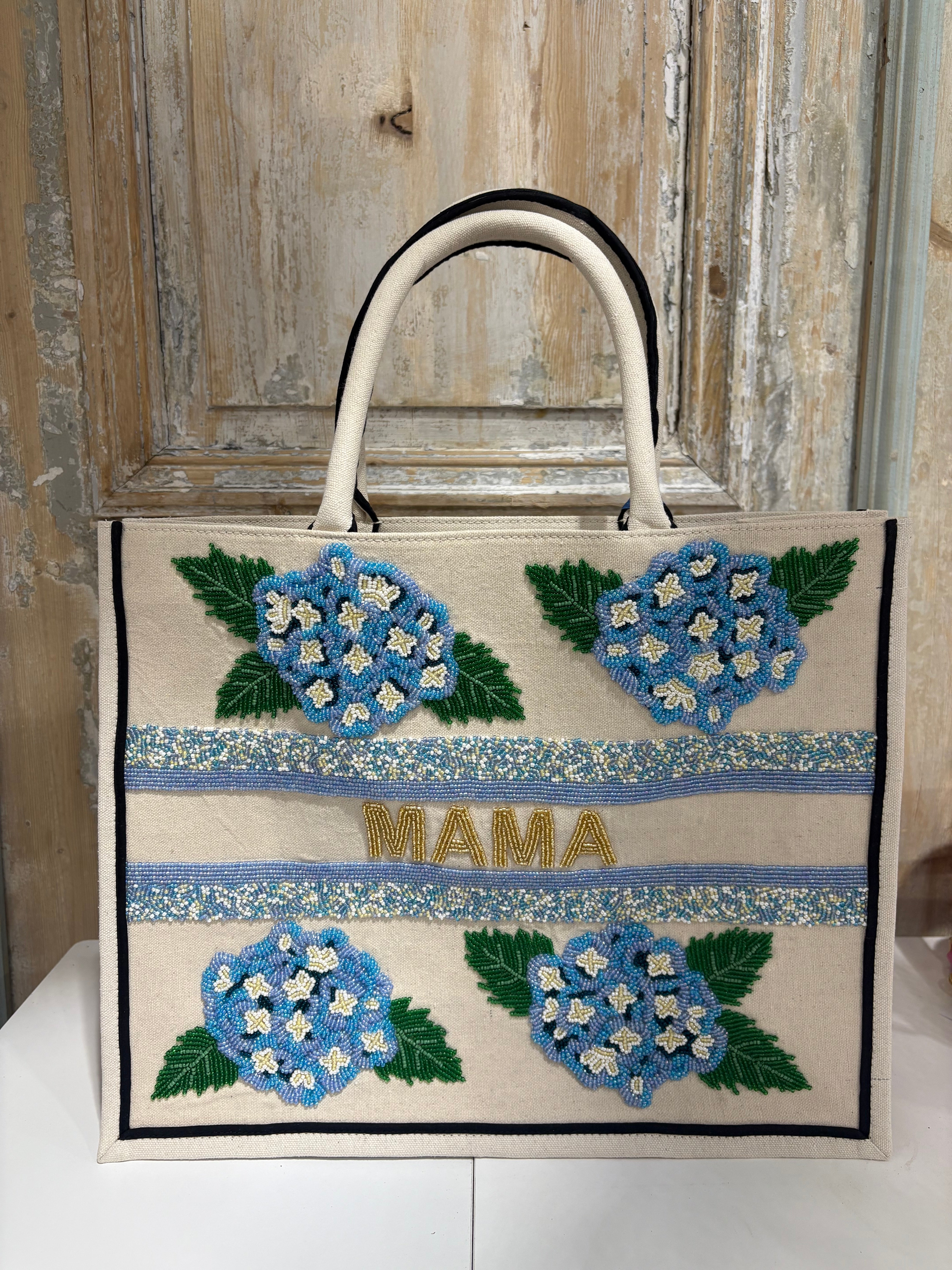 Canvas Tote with fully beaded front measures 16″ wide, 13″ tall , 6″ deep. Satin-lined with one small inside open pocket. Open top. Canvas Handles.