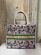 Bags can be customized. Please call or text us for a custom order. Indicate your choice of Text to be placed in the center band of the bag. Please allow 4 weeks for the shipment of your custom Tote.