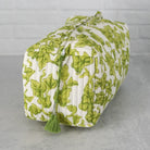 This cosmetic bags are constructed from a quilted block-printed cotton. The inside is lined with plastic for easy clean-up, with two handy pockets. A pretty tassel is attached to the zipper. Measures 10″ long, 5″ wide x 5″ high.