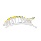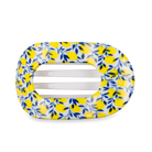 Lay flat and relax with the new TELETIES Limoncello Flat Round Hair Clip with a bold lemon print in yellow and blue. This hair clip is designed to allow you to lay back flat, do yoga, or sit comfortably in a seat with a headrest, and it is made with the same material that is nearly unbreakable.